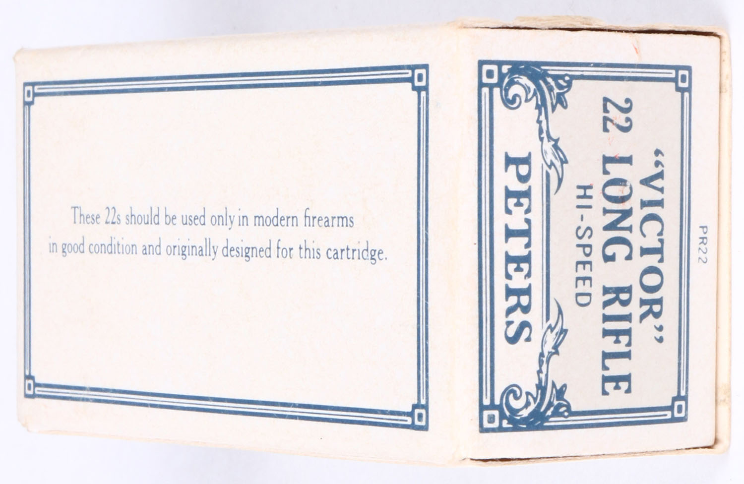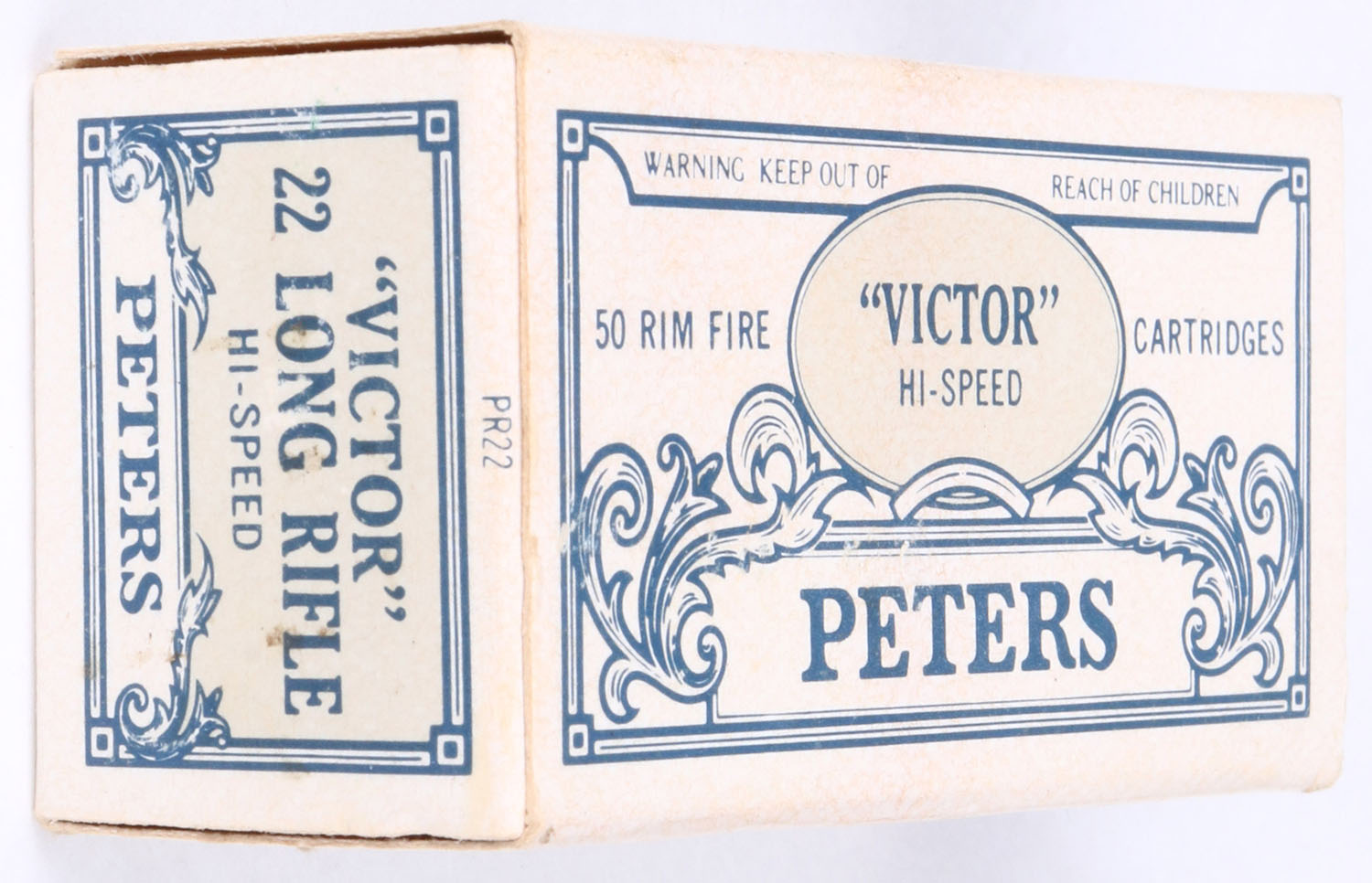 Peters, ''Victor'' Hi-Speed, .22 Long Rifle, RHWeb: PCC-22 LR-1, Full, 1pc. White & blue box, box is solid with excellent color, very minor age soiling, corners are mostly sharp, edges are crisp, end flaps are solid, ammo is excellent. Grade: Excellent ++ - Value: 6 to 30