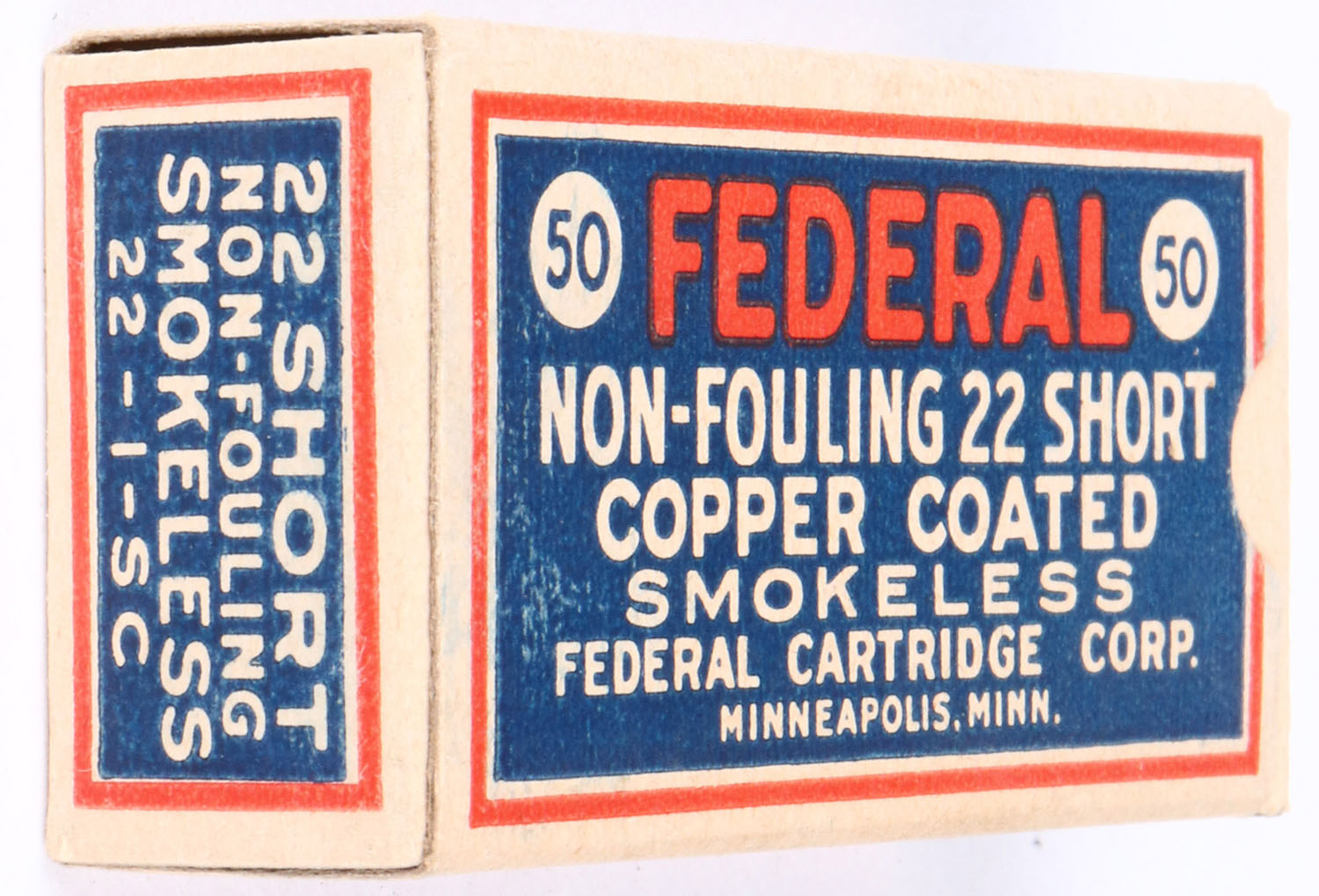 Federal, Non-Fouling, .22 Short, Copper Coated, RHWeb: FCC-3 S-2c, Full, 1pc. Blue red & white box, box is near mint with excellent to minty color, only very minor age soiling & shelf wear, corners are sharp, edges are crisp, end flaps are solid, ammo is excellent. Grade: MINT - Value: 50 to 250