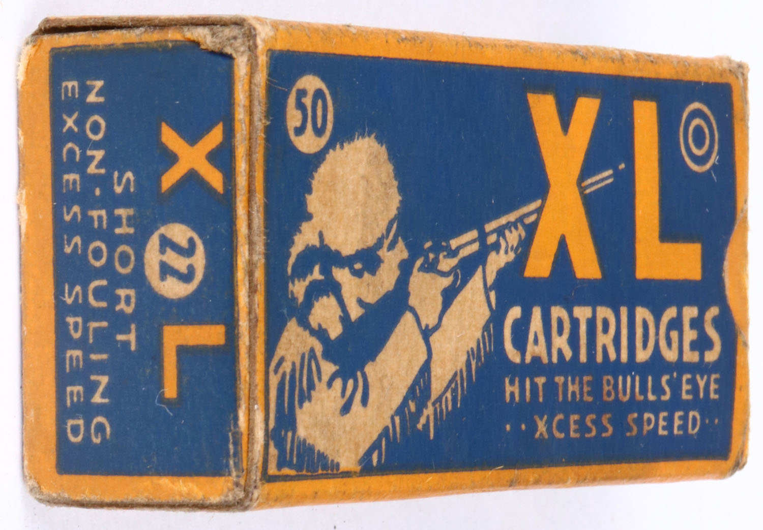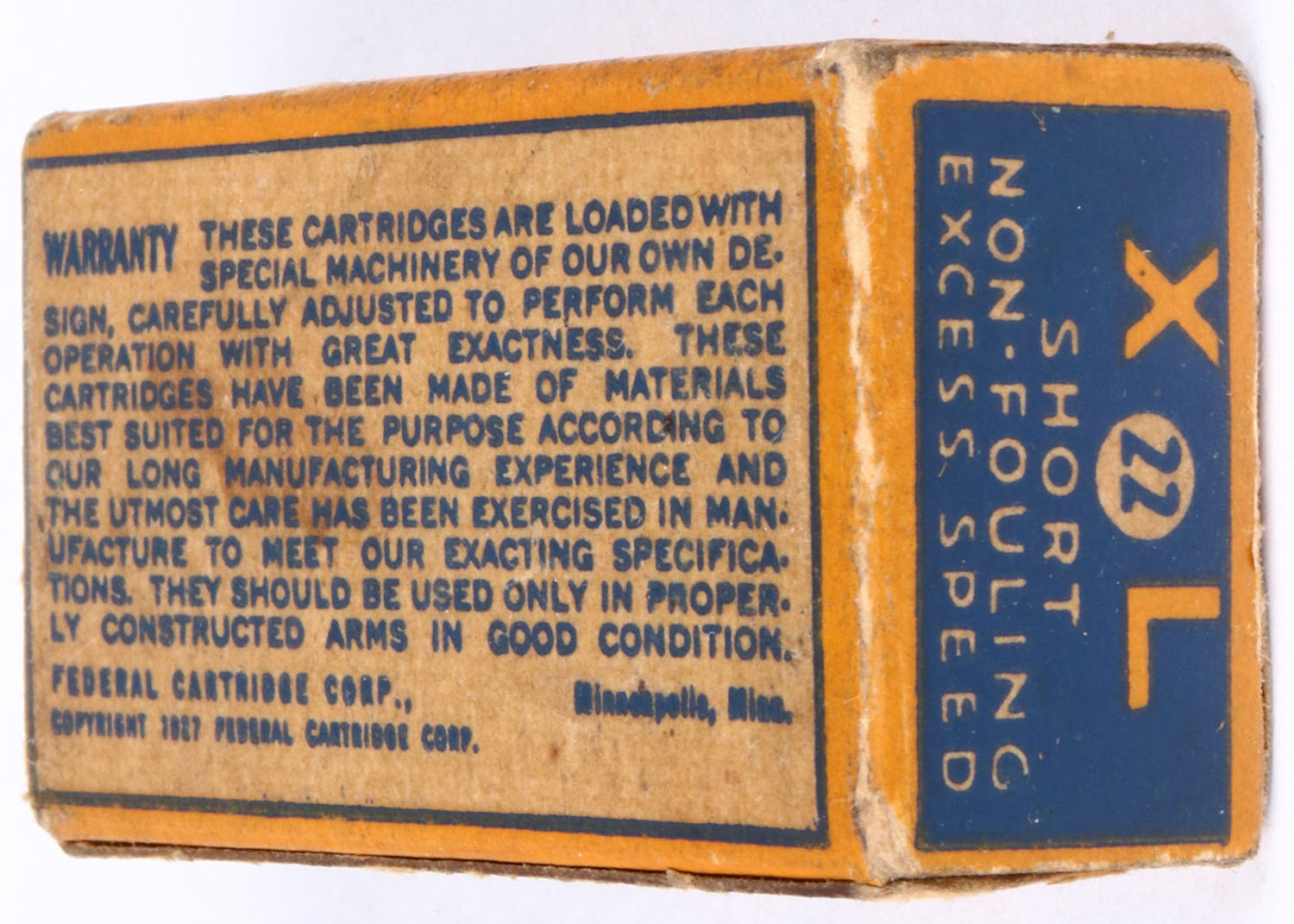 Federal, XL Cartridges, .22 Short, RHWeb: FCC-4.1 S-2d, Full, 1pc. Blue orange & white box, box is solid with very good color, some age soiling, minor corner wear, edges are mostly crisp, end flaps are solid, ammo is excellent. Grade: Excellent + - Value: 100 to 300