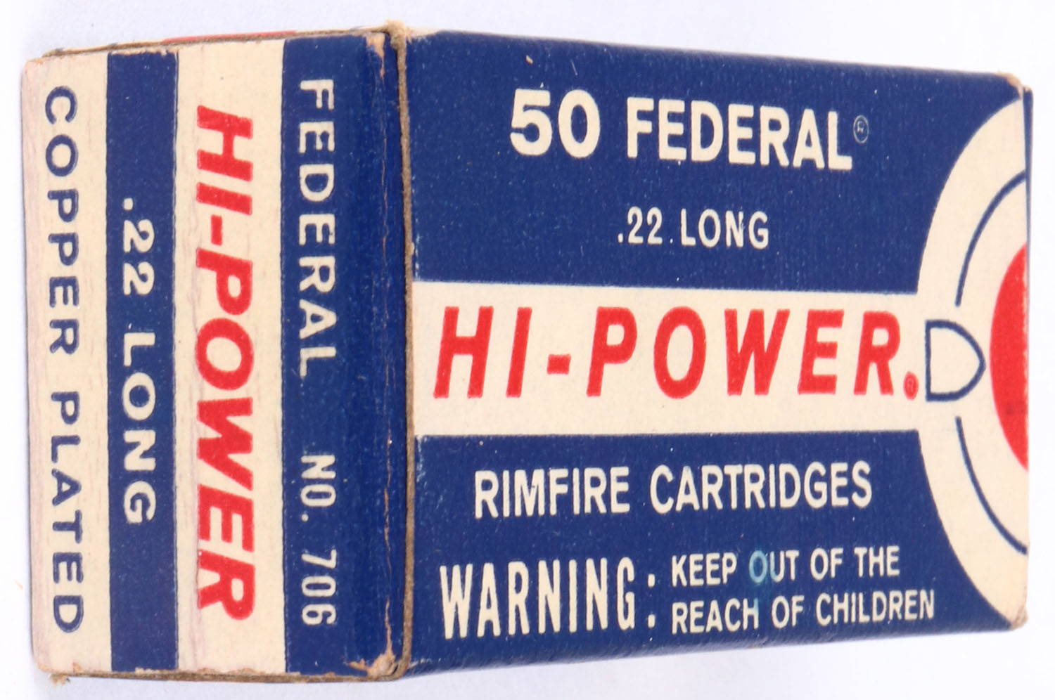 Federal, Hi-Power, .22 Long, RHWeb: FED-8 L-1, Full, 1pc. Blue white & red box, box is solid with excellent color, very minor age soiling & corner wear, edges are crisp, end flaps are solid, ammo is excellent. Grade: Excellent + - Value: 10 to 50