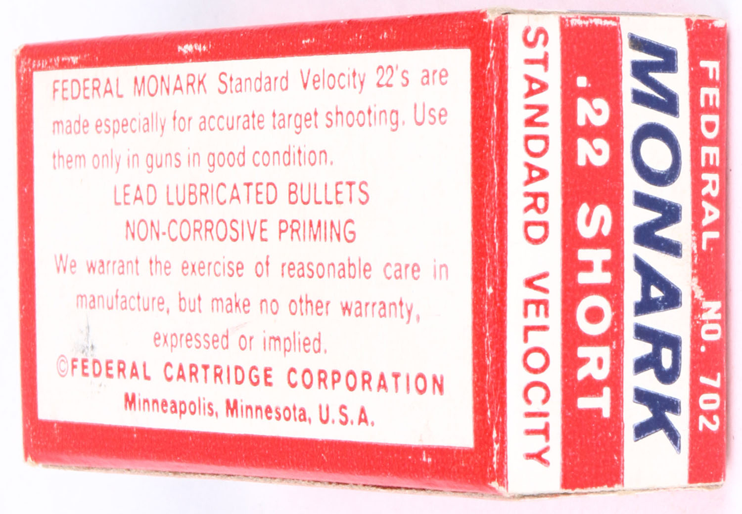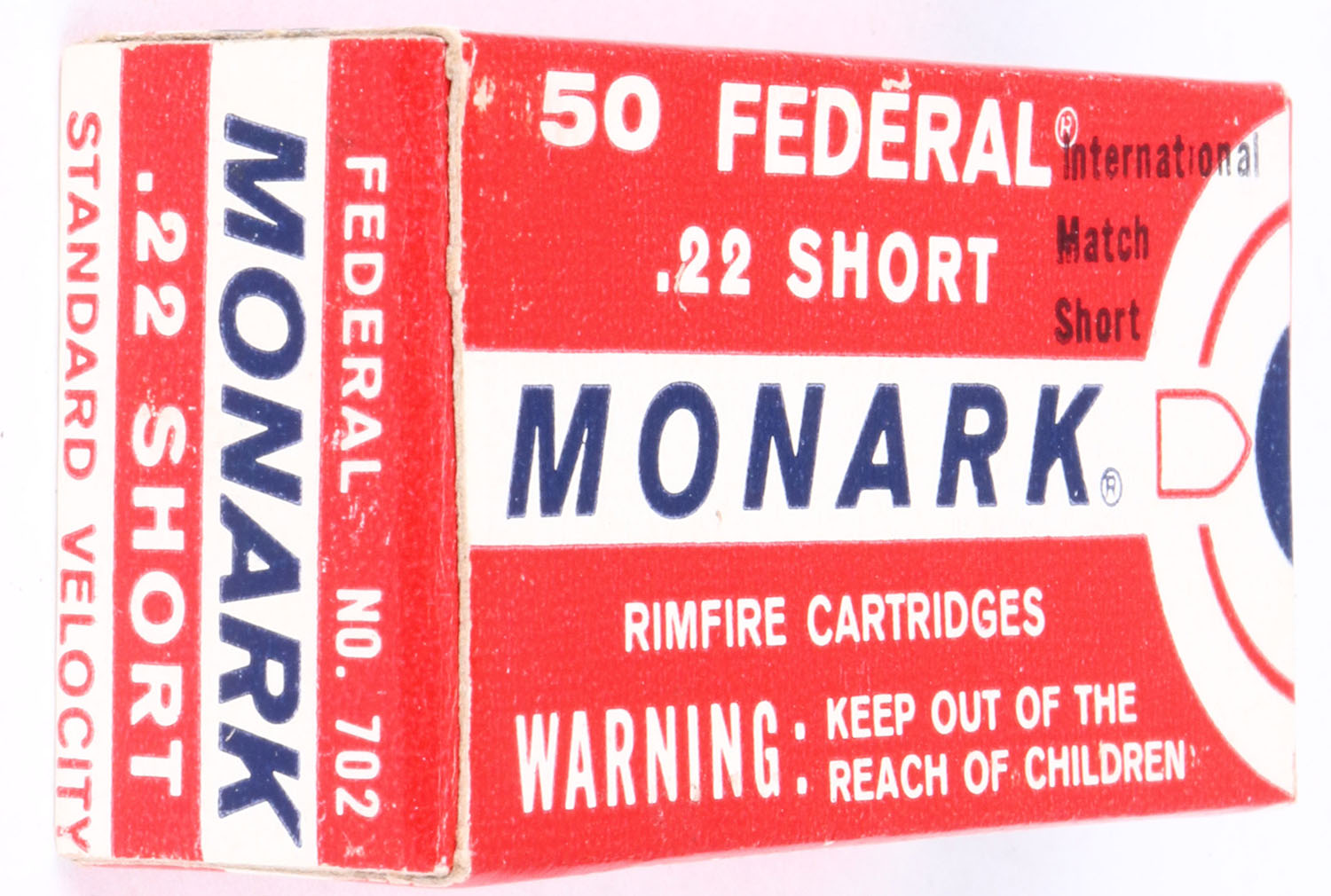 Federal, Monark, International Match Short, .22 Short, RHWeb: FED-8 S-4, Full, 1pc. Red white & blue box, box is MINT with minty color, corners are sharp, edges are crisp, end flaps are solid, ammo is mint. Grade: MINT - Value: 40 to 160