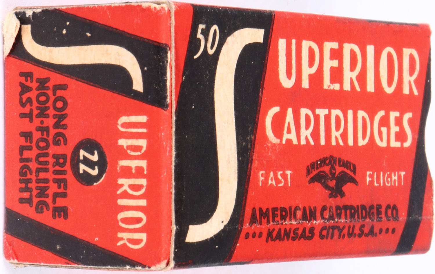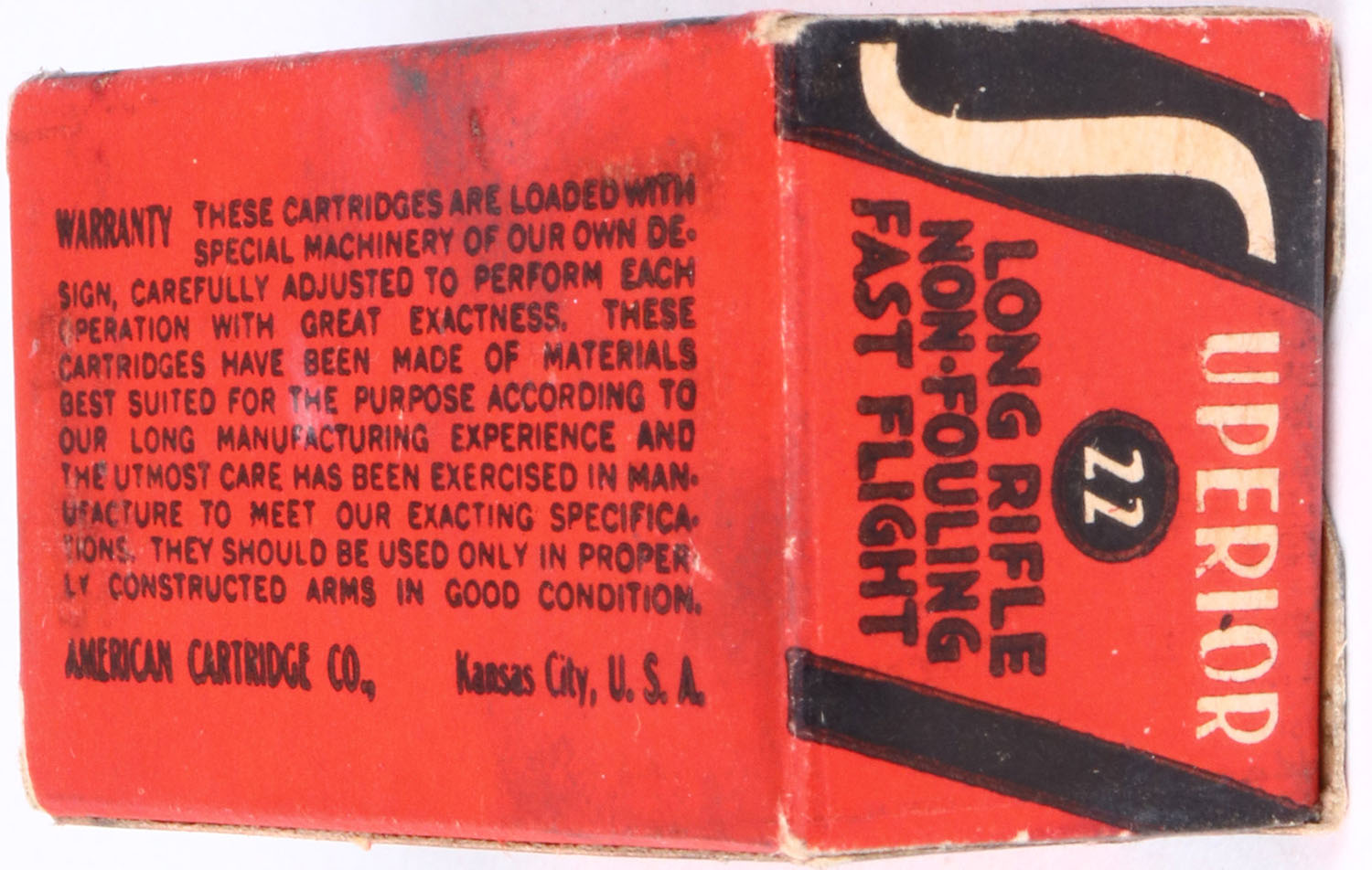 American, Superior Cartridges, .22 Long Rifle, RHWeb: ACC-2 LR-1b, Full, 1pc. Red black & white box, box is solid with excellent color, very minor age soiling & corner wear, edges are crisp, end flaps are solid, ammo is excellent. Grade: Excellent + - Value: 10 to 50