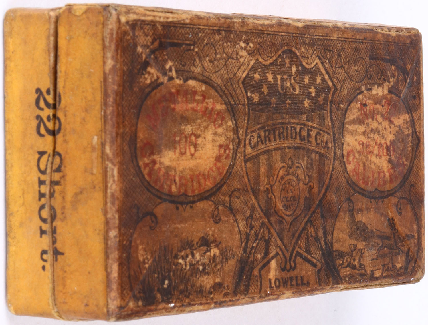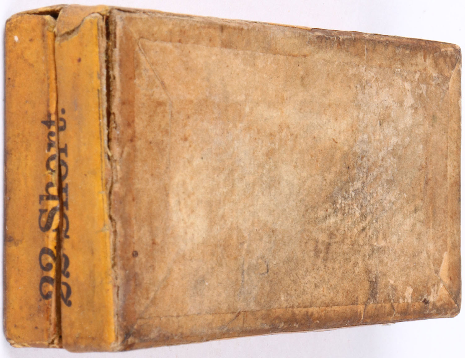 U.S., Target Cartridges, .22 Short, Metallic Cartridges, 22/100 Calibre, 100rd box, RHWeb: US-2 S-1b, Partial 1rd., 2pc. Buff box with gray top & yellow side sealing labels, box is solid with fair to good color, age soiling, some shelf wear, minor edge & corner wear, two vertical seam splits to back corners of lid, labels are intact, ammo is good. Grade: Very Good - Value: 20 to 200