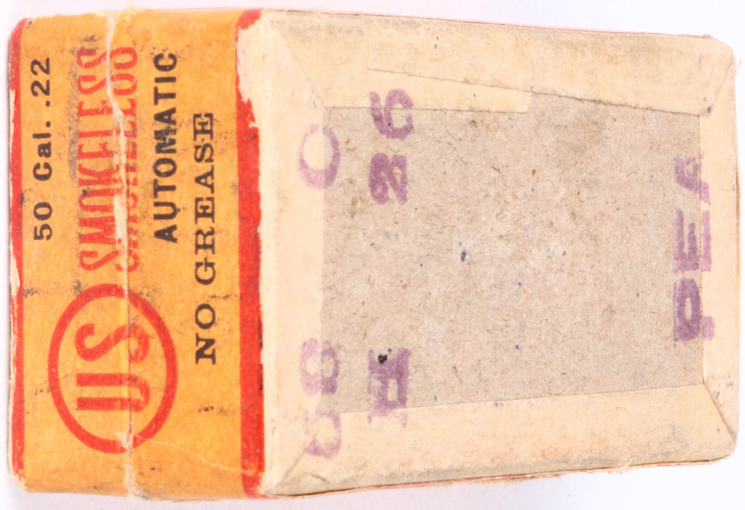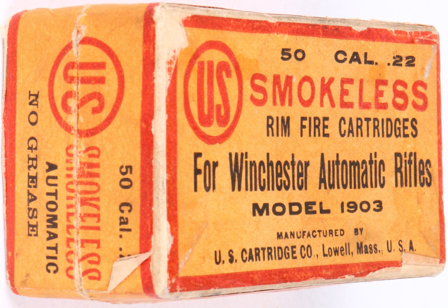 U.S., Smokeless, .22 Winchester Automatic, RHWeb: US-6 WA-1, Full, 2pc. Buff box with orange & red top & side sealing labels with insert, box is solid with excellent color, minor age soiling, minor edge & corner wear, labels are intact, insert is excellent, ammo is excellent. Grade: Excellent - Value: 50 to 250