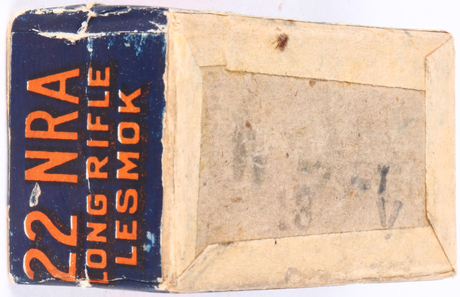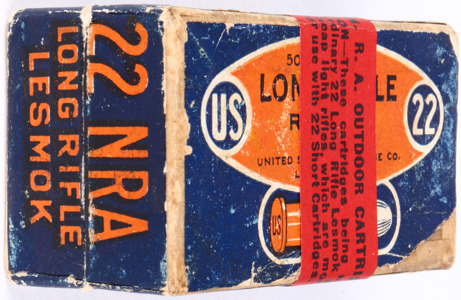 U.S., NRA, .22 Long Rifle, Target Issue, Lesmok, RHWeb: US-51 LR-3, Full, 2pc. Blue & orange box with red over label, box is solid with excellent color, small tear to top label, very minor age soiling, some shelf & edge wear, corners are mostly sharp, ammo is very good. Grade: Excellent - Value: 20 to 100