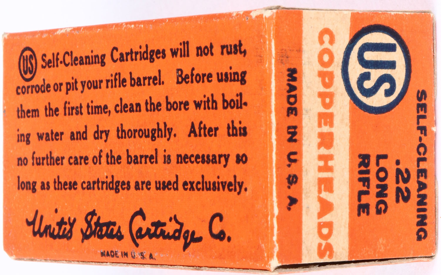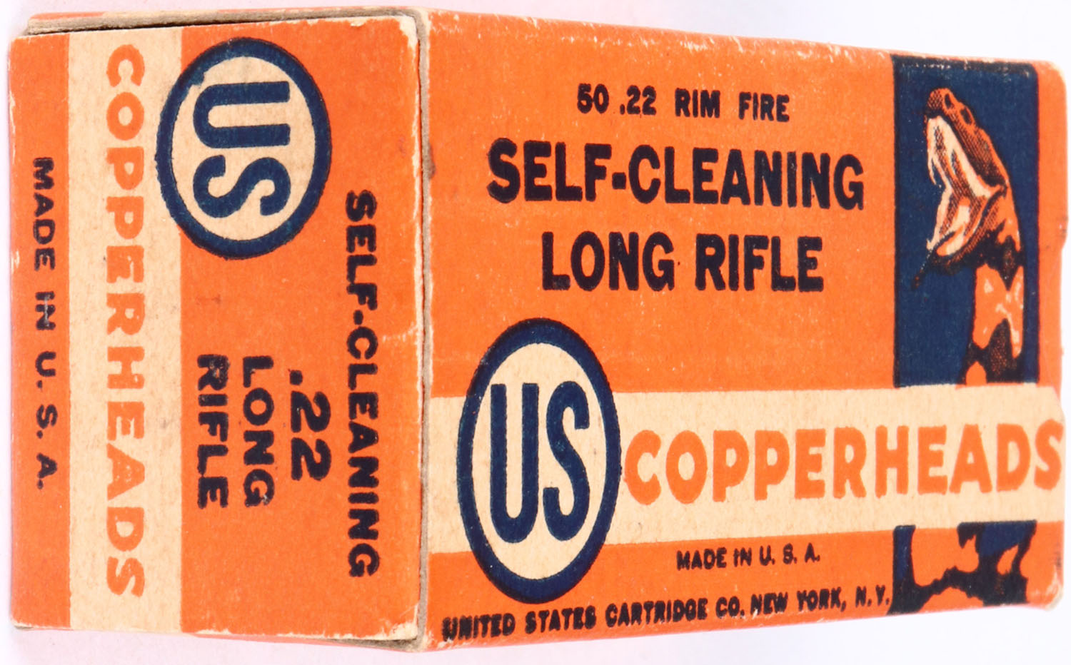 U.S., Copperheads, .22 Long Rifle, Self-Cleaning, RHWeb: US-12 LR-1b, Full, 1pc. Orange black & white box, box is solid with excellent color, minor age soiling, very minor corner wear, corners are mostly sharp, edges are crisp, end flaps are solid, ammo is excellent. Grade: Excellent + - Value: 20 to 60