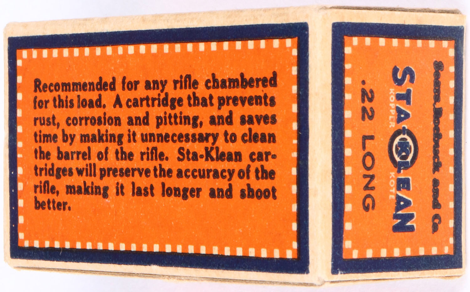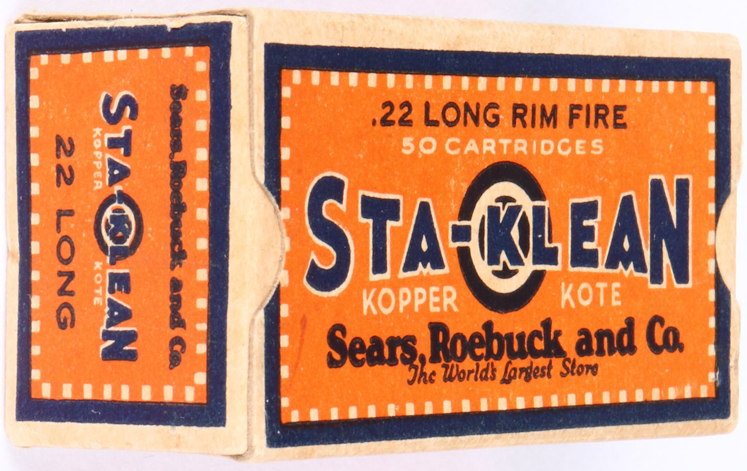 Sears, Sta-Klean, .22 Long, Kopper Kote, RHWeb: SEARS-3 L-1c, Full, 1pc. Orange blue & buff box, box is solid with excellent color, only very minor age soiling corners are mostly sharp, edges are crisp, end flaps are solid, ammo is excellent to minty. Grade: Excellent ++ - Value: 50 to 150