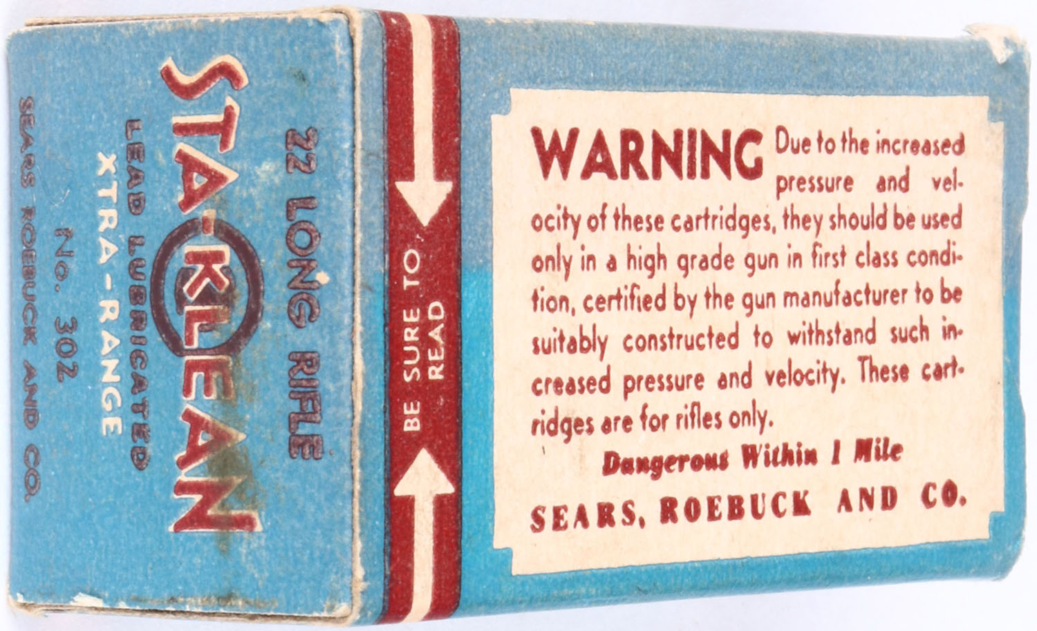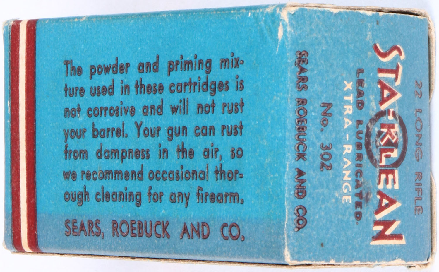 Sears, Sta-Klean, .22 Long Rifle, No. 302, Xtra-Range, RHWeb: SEARS-6 LR-4e, Full, 1pc. Blue white & brick colored box, box is solid with excellent color, very minor color fading on back side, minor corner wear, edges are mostly crisp, end flaps are solid, ammo is excellent. Grade: Excellent + - Value: 8 to 40