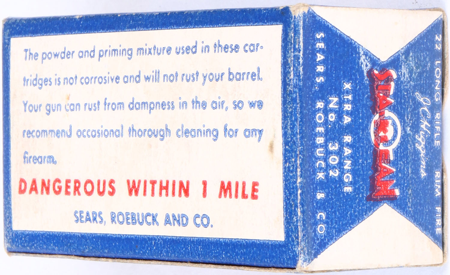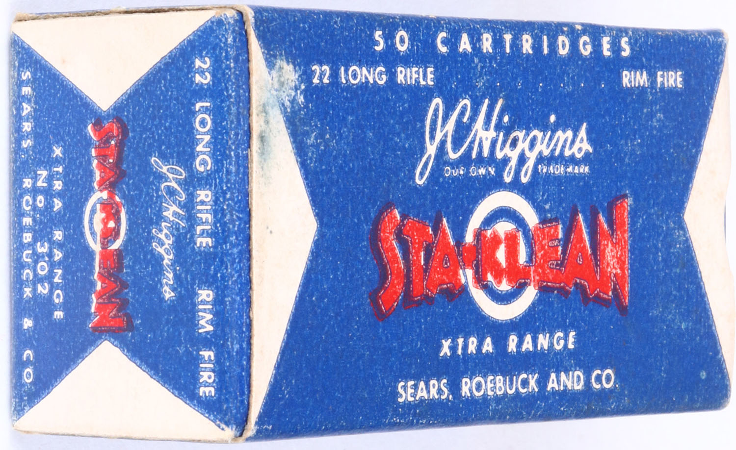 Sears, JC Higgins Sta-Klean, .22 Long Rifle, Xtra Range, RHWeb: SEARS-7 LR-1a, Full, 1pc. Blue white & red box, box is solid with excellent color, minor shelf wear, corners are mostly sharp, edges are crisp, end flaps are solid, ammo is excellent. Grade: Excellent + - Value: 10 to 50