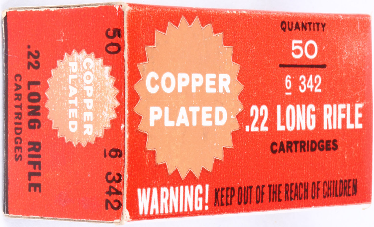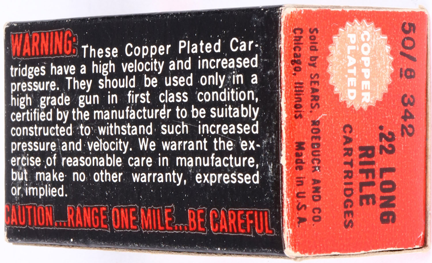 Sears, Copper Plated, .22 Long Rifle, RHWeb: SEARS-11 LR-1b, Full, 1pc. Red white & black box, box is solid with excellent to minty color, only very minor shelf wear, corners are mostly sharp, edges are crisp, end flaps are solid, ammo is minty. Grade: Excellent ++ - Value: 6 to 30