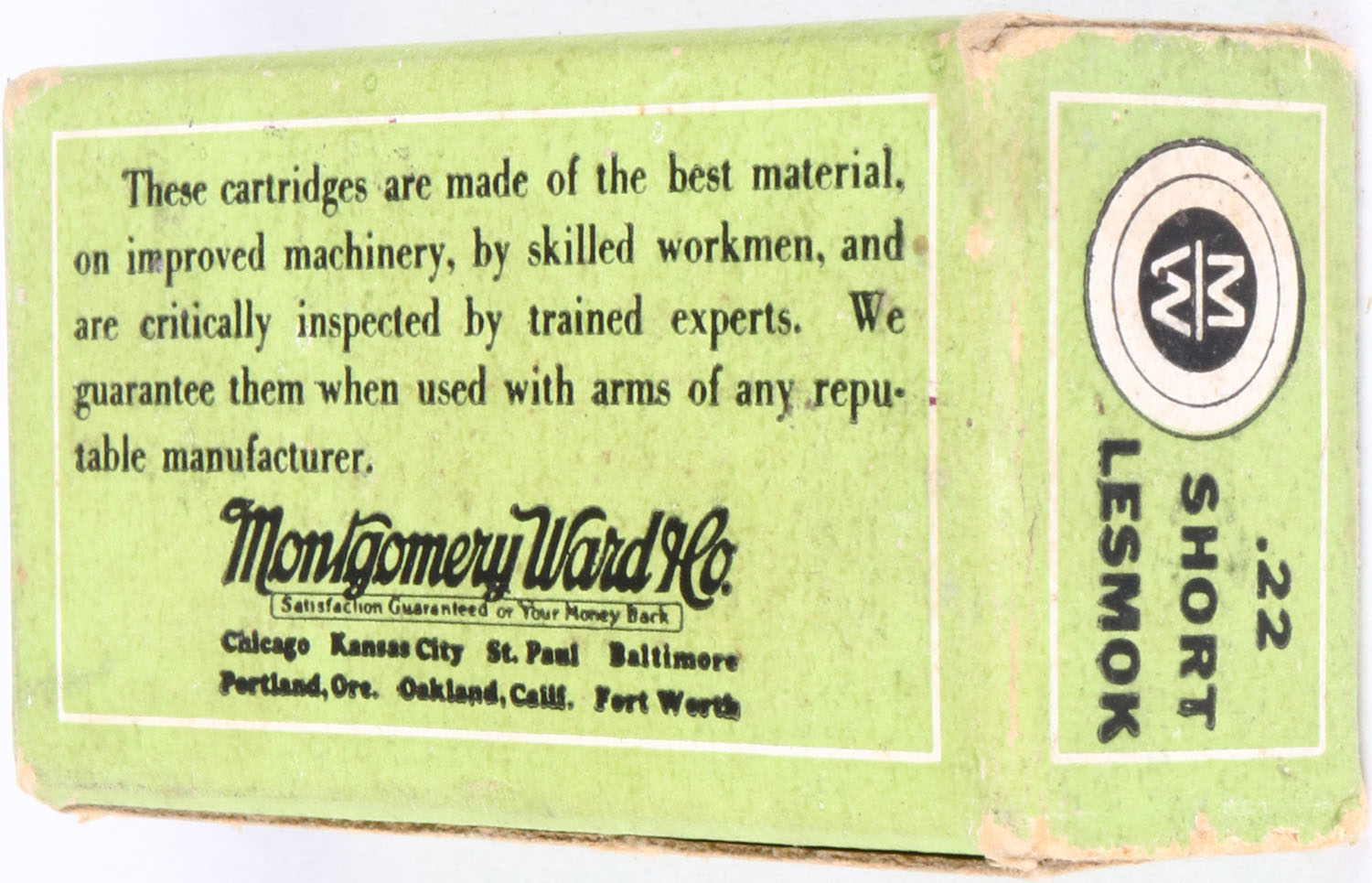Wards, Lesmok Rim Fire Cartridges, .22 Short, RHWeb: MW-1 S-2a, Full, 1pc. Green black & white box, box is solid with excellent color, very minor age soiling & edge wear, minor corner wear, end flaps are solid, ammo is good to very good. Grade: Excellent + - Value: 100 to 300