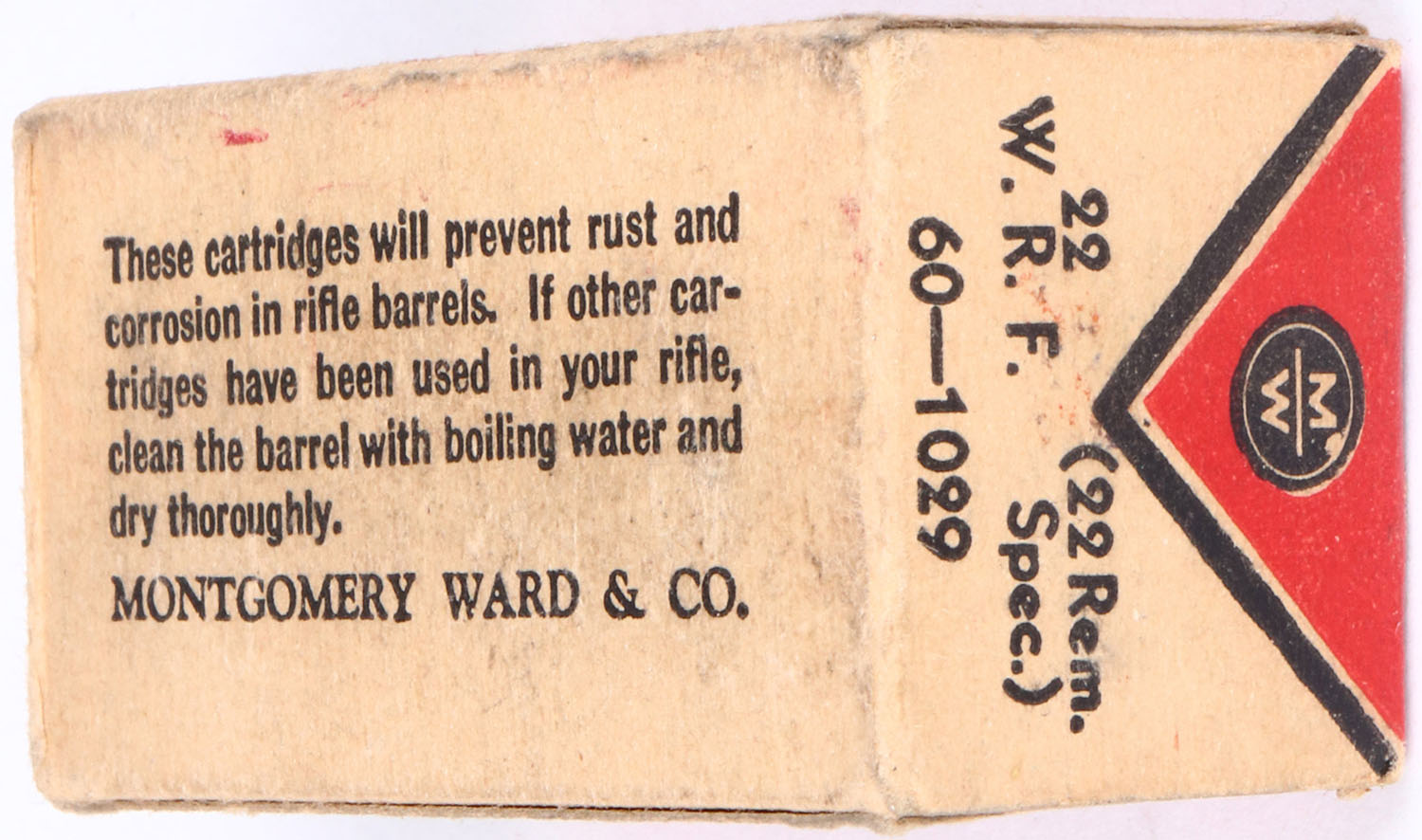 Wards, CleanFire, .22 W.R.F., Extra Power, RHWeb: MW-3D WRF-4b, Partial 35rds., 1pc. Red white & black box, box is solid with very good color, age soiling, some shelf wear, minor edge & corner wear, end flaps are solid, ammo is very good. Grade: Very Good ++ - Value: 10 to 100