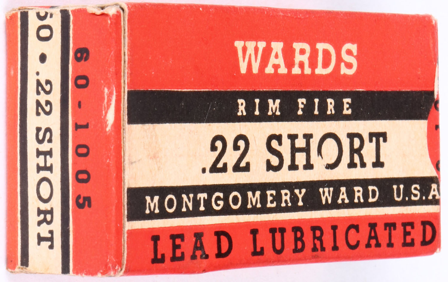 Wards, Rim Fire, .22 Short, Lead Lubricated, RHWeb: MW-4A S-1a, Full, 1pc. Red white & black box, box is solid with excellent color, minor age soiling, very minor corner wear, edges are crisp, end flaps are solid, ammo is minty. Grade: Excellent + - Value: 10 to 50