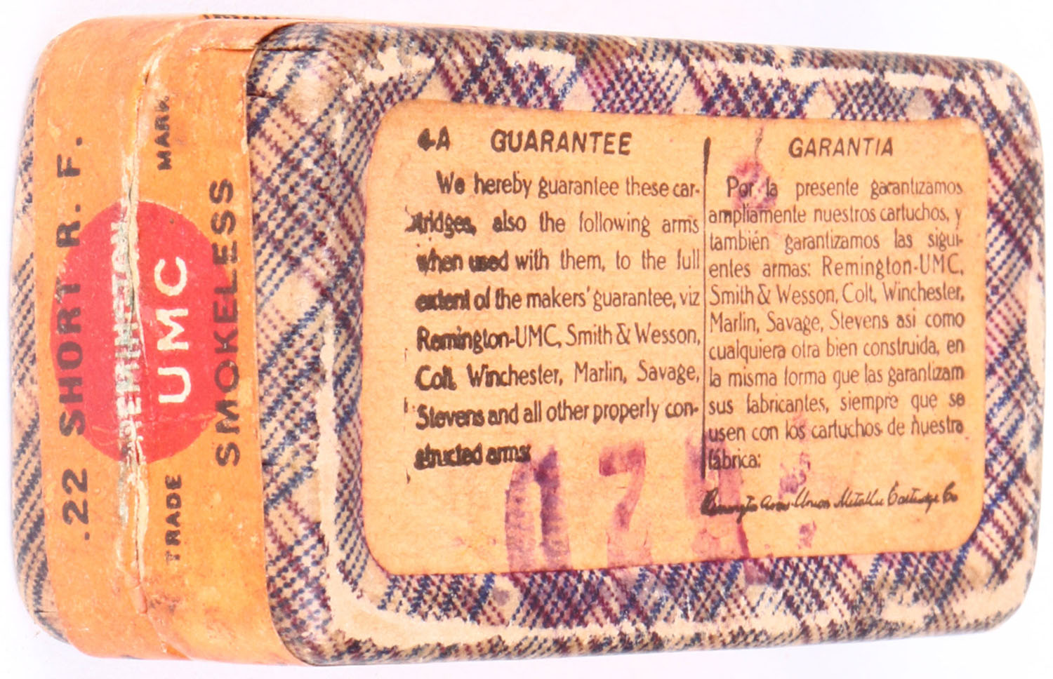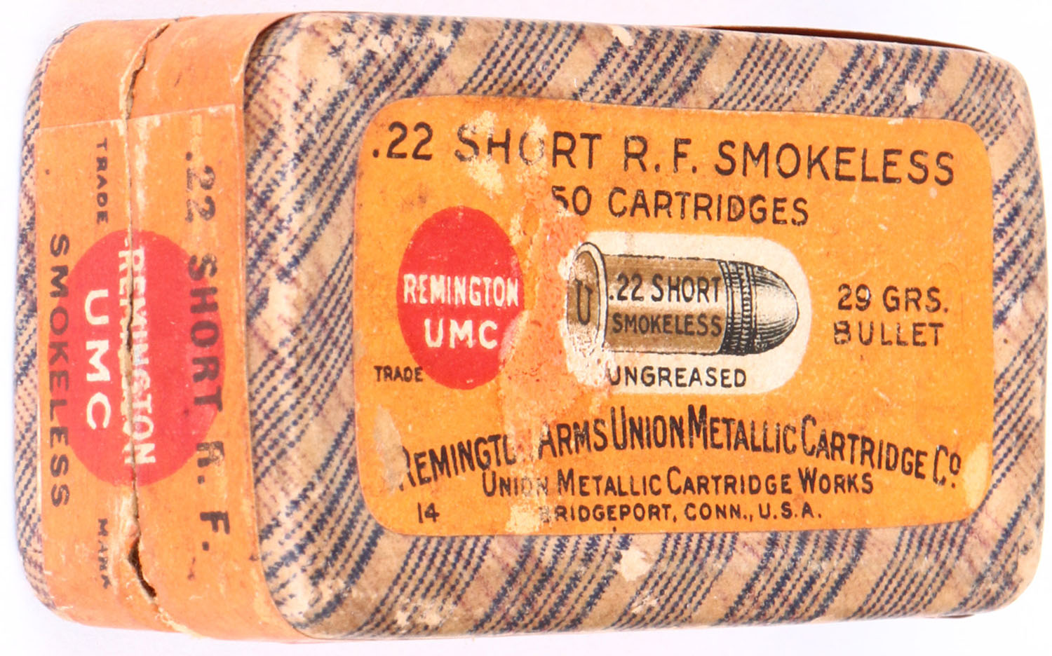 REM-UMC. .22 Short, Smokeless Ungreased, RHWeb: REM-2 S-5F, Full, 2pc. Purple fabric box with orange top & side sealing labels, box is solid with excellent color, minor age soiling, very minor edge & corner wear, edges are mostly crisp, minor scuffing to top label, labels are intact, ammo is very good to excellent. Grade: Excellent - Value: 40 to 120