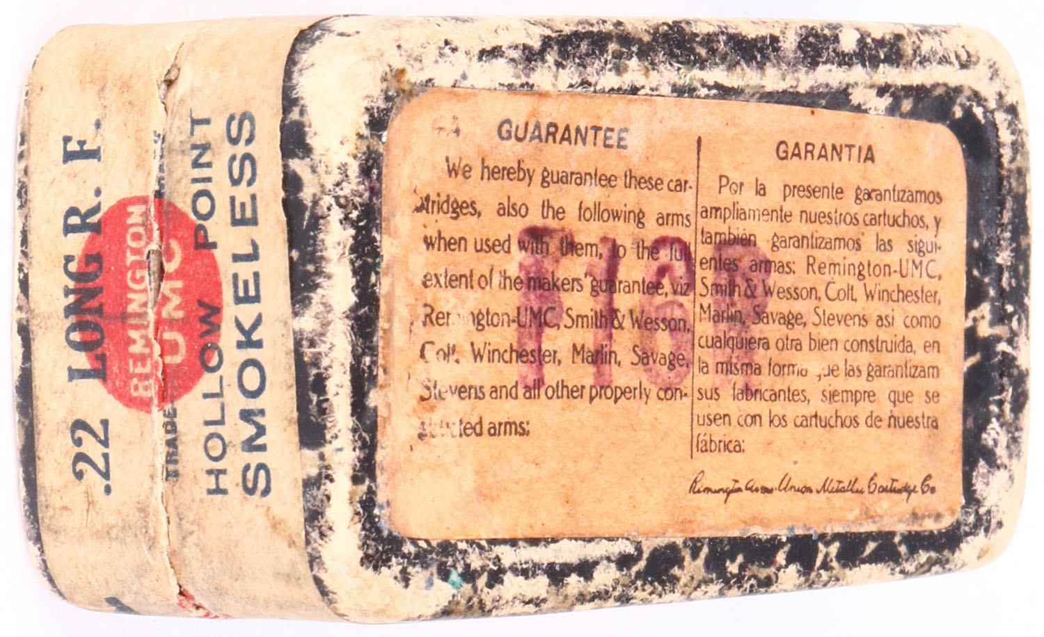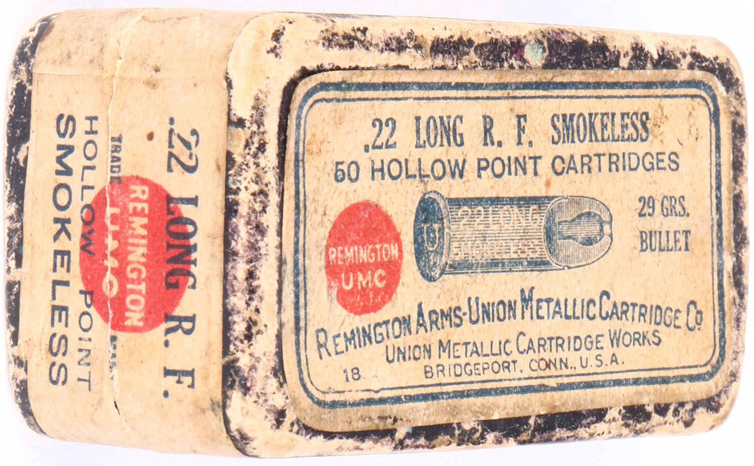 REM-UMC, .22 Long Hollow Point, Smokeless, RHWeb: REM-2 L-13, Full, 2pc. Black mottled box with buff top & side sealing labels, box is solid with excellent color, minor age soiling, some edge & corner wear, labels are intact, ammo is very good. Grade: Excellent - Value: 30 to 150