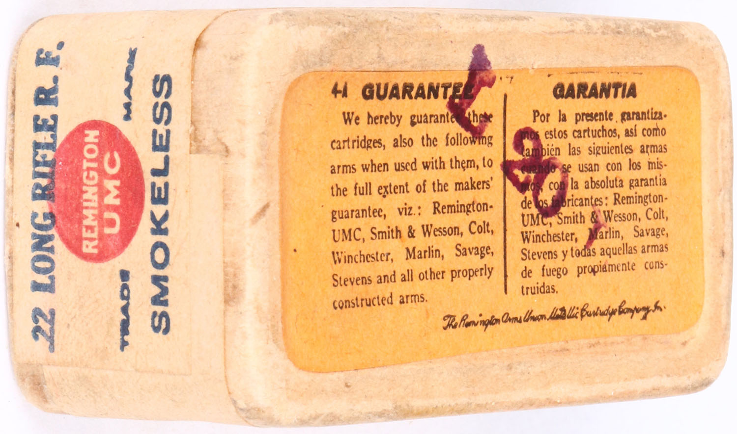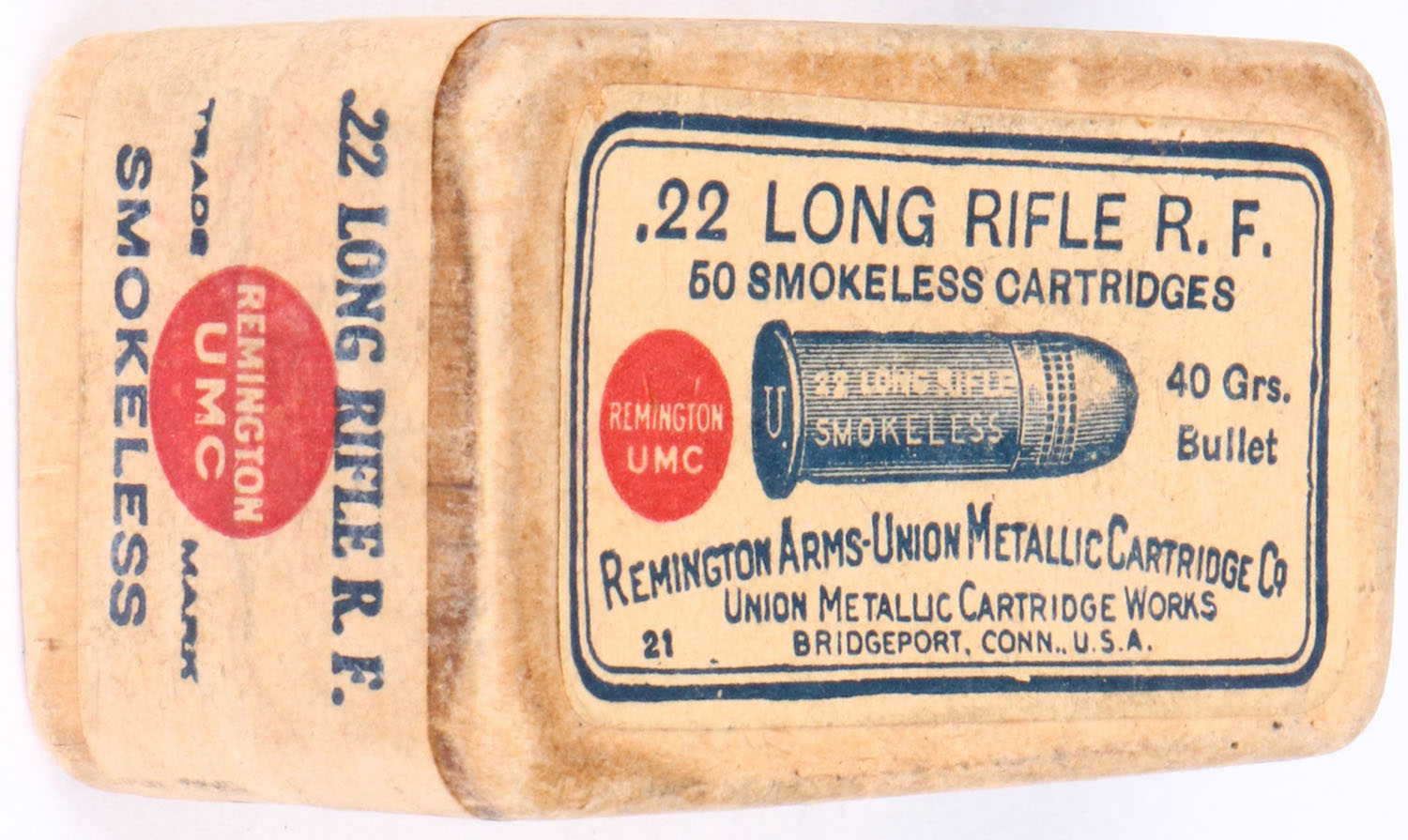 REM-UMC, .22 Long Rifle, Smokeless, RHWeb: REM-2 LR-5.5A, FULL & SEALED, 2pc. Buff box with buff top & side sealing labels, box is solid with excellent to minty color, only very minor age soiling & edge wear, labels are intact. Grade: Excellent ++ - Value: 40 to 160