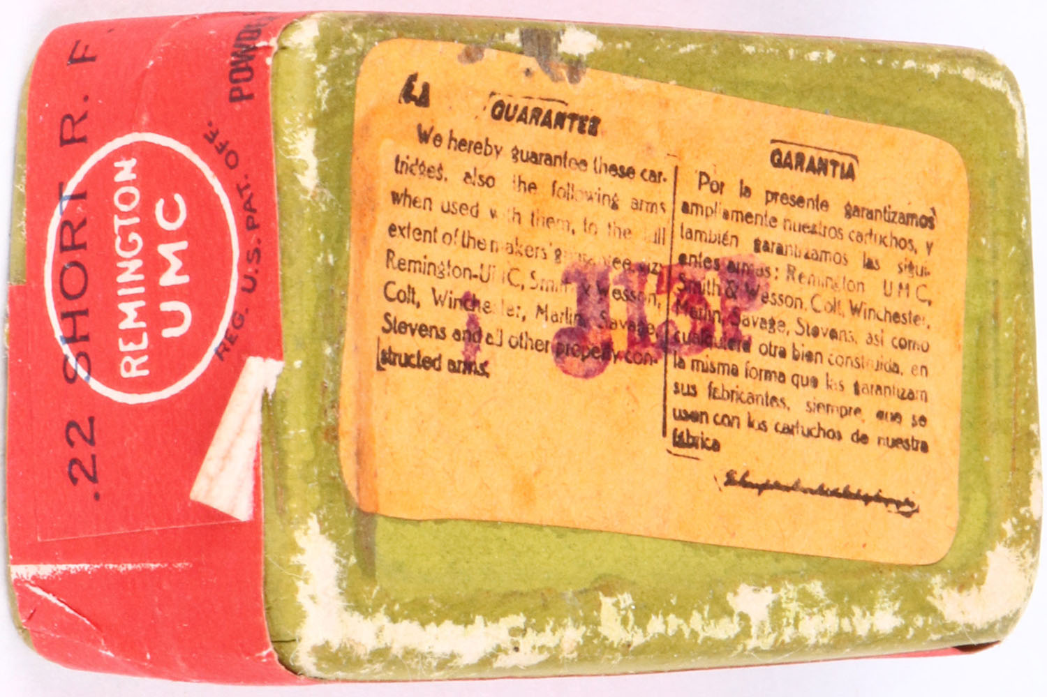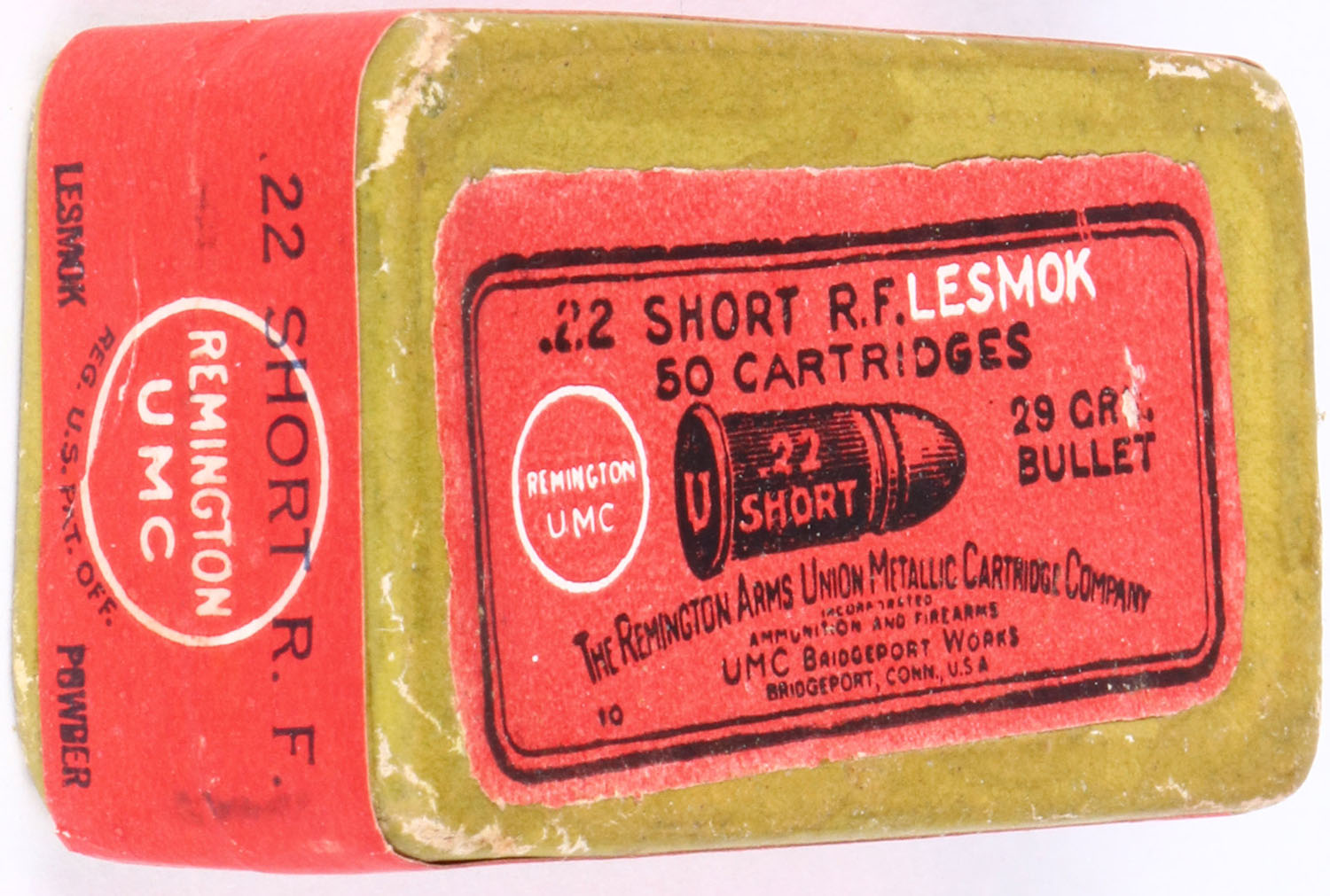 REM-UMC, .22 Short, Lesmok, RHWeb: REM-3 S-2B, FULL & SEALED, 2pc. Green box with red top & side sealing labels, box is solid with excellent color, very minor edge & corner wear, minor shelf wear on bottom, labels are intact. Grade: Excellent + - Value: 20 to 200