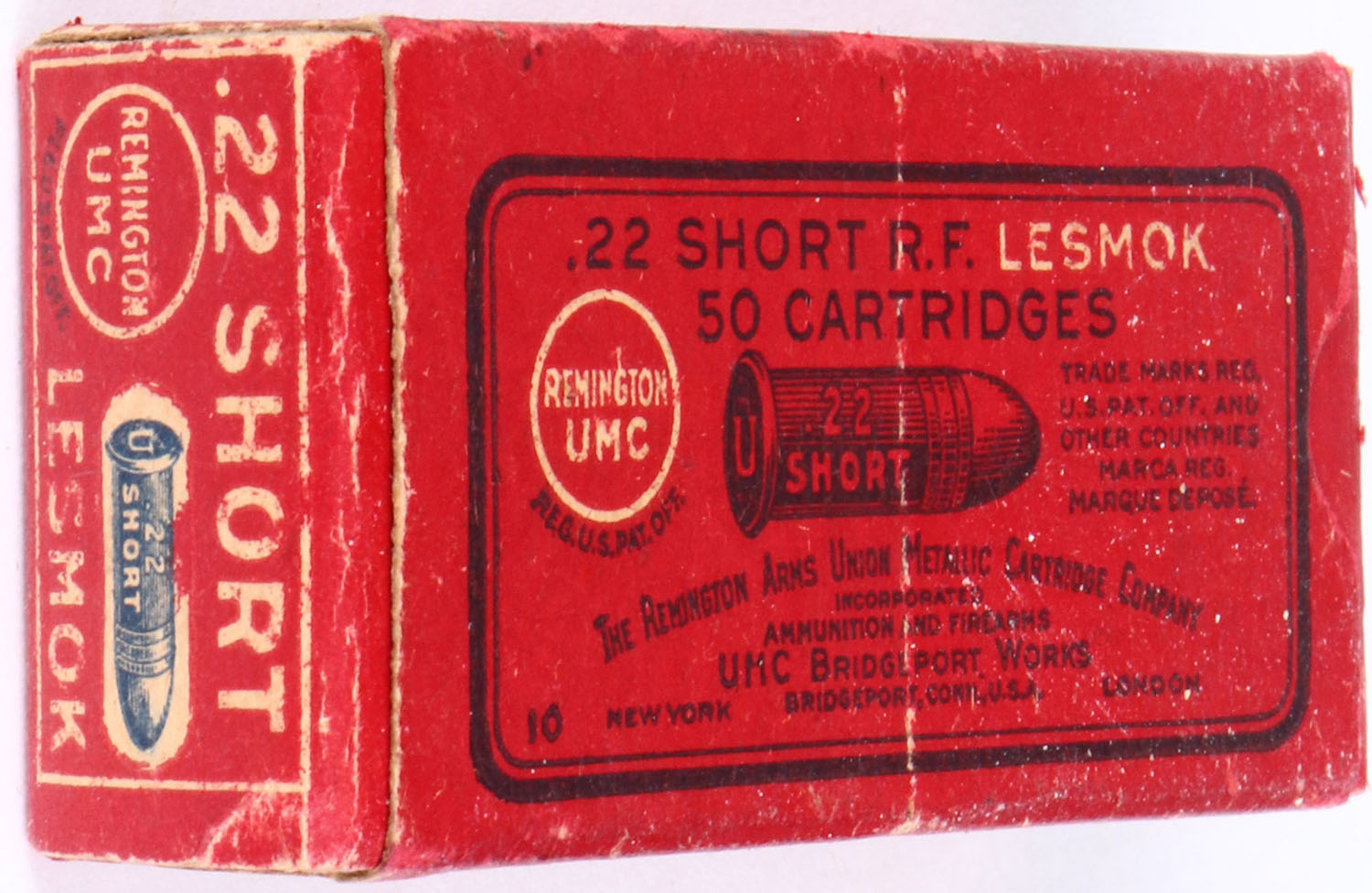 REM-UMC, .22 Short, Lesmok, RHWeb: REM-4 S-2B, Full, 1pc. Red box with black & white printing, box is solid with excellent color, minor age soiling, minor edge & corner wear, end flaps are solid, ammo is good. Grade: Excellent - Value: 20 to 60