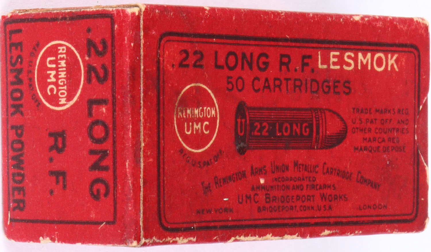 REM-UMC, .22 Long, Lesmok, RHWeb: REM-4 L-1, Full, 1pc. Red box with black & white printing, box is solid with very good to excellent color, some age soiling, minor edge & corner wear, end flaps are solid, ammo is good to very good. Grade: Excellent - Value: 20 to 60