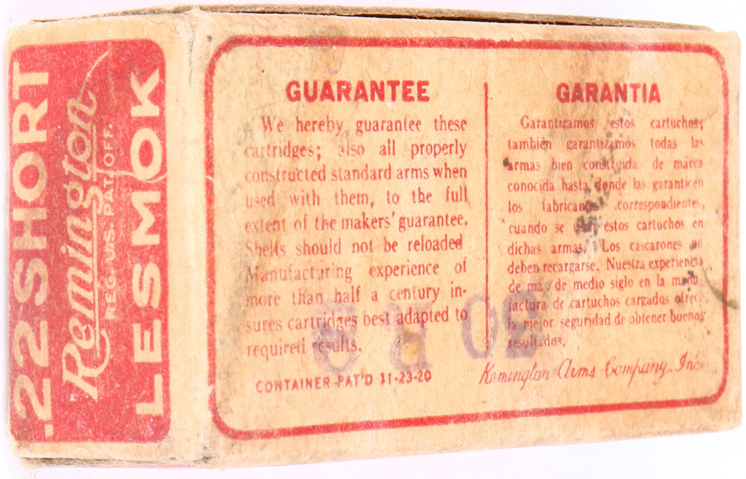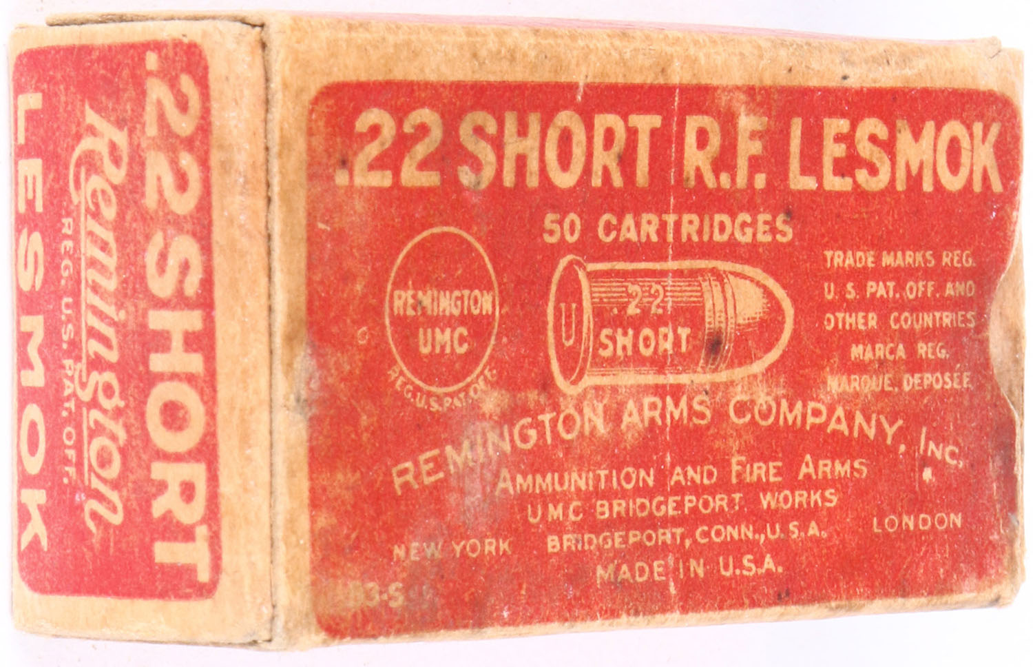 REM-UMC, .22 Short, Lesmok, RHWeb: REM-6 S-2.1A, Full, 1pc. Red & buff box, box is solid with very good color age soiling some corner wear, very minor edge wear, end flaps are solid, ammo is very good. Grade: Very Good + - Value: 6 to 30