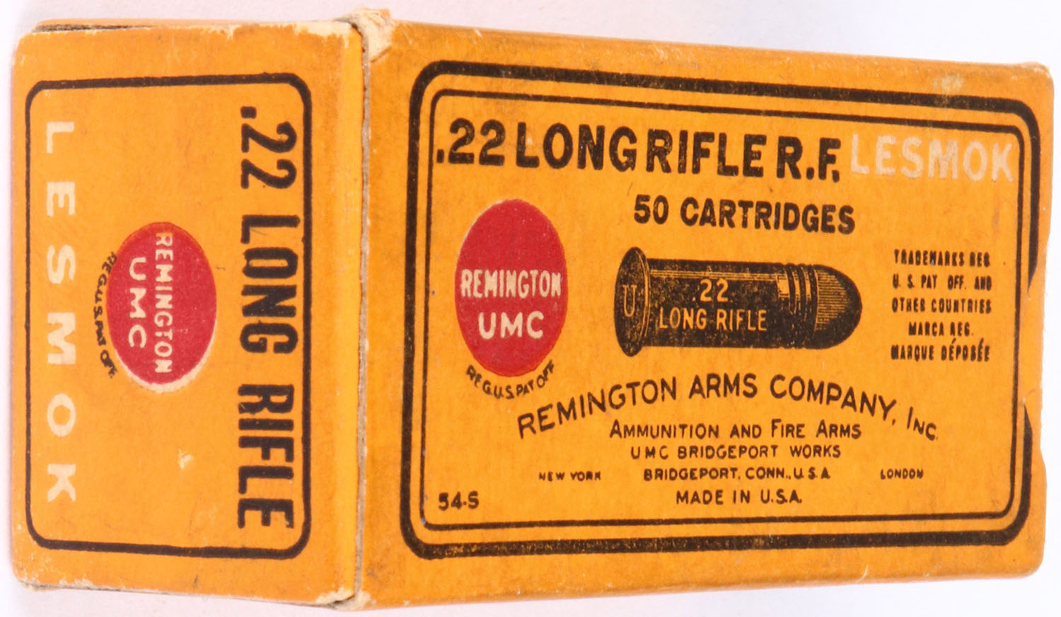 REM-UMC, .22 Long Rifle, Lesmok, RHWeb: REM-6 LR-1, Full, 1pc. Orange black & red box, box is solid with excellent color, minor age soiling, very minor corner wear, edges are crisp, end flaps are solid, ammo is very good to excellent. Grade: Excellent + - Value: 20 to 60