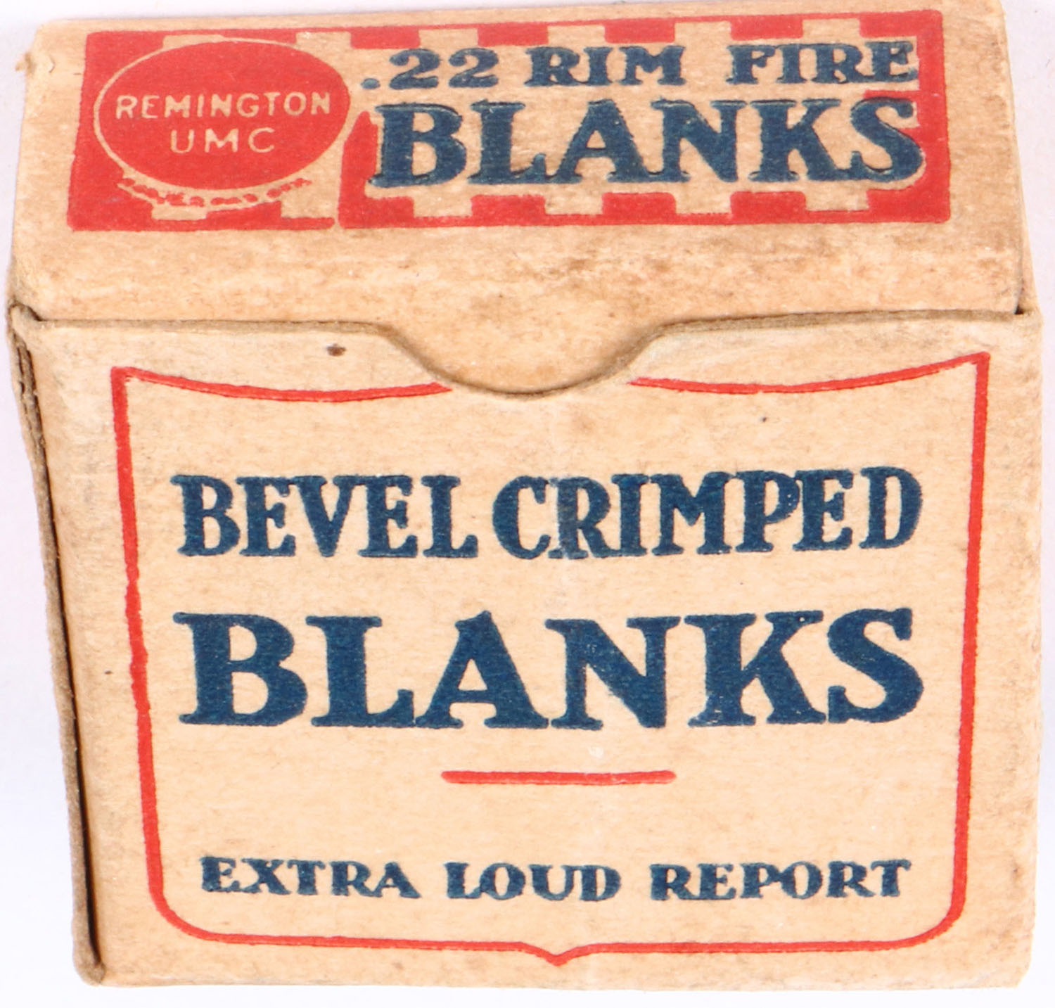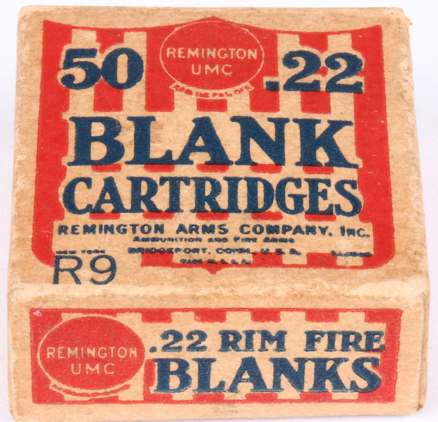 Remington, Blank Cartridges, .22 Short, RHWeb: REM-7.1B SB-1, Full, 1pc. Red blue & white box, box is solid with very good to excellent color, some age soiling, minor edge and corner wear, side flaps are solid, ammo is excellent. Grade: Excellent + - Value: 10 to 50