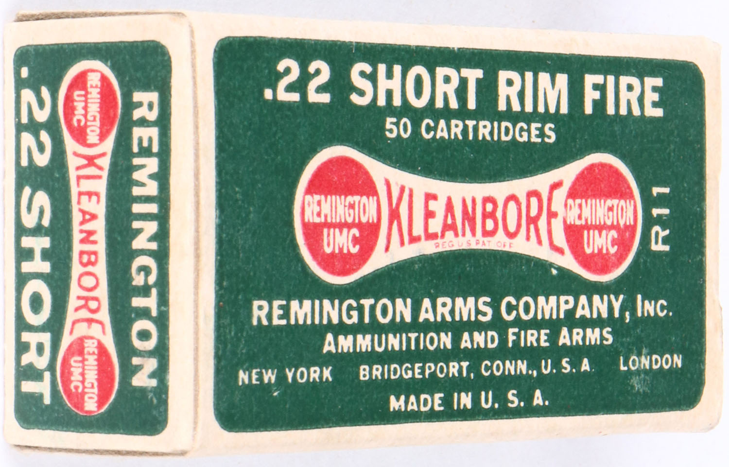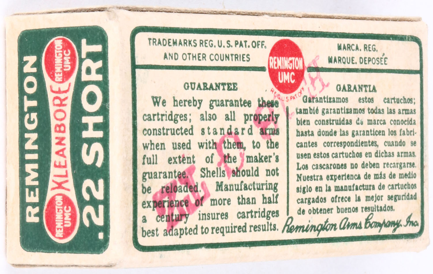 Remington, Kleanbore, .22 Short, RHWeb: REM-7.1B S-1e, Full, 1pc. Green white & red dogbone box, box is near mint with minty color, only very minor corner wear and very minor age soiling on bottom, edges are crisp, end flaps are solid, ammo is very good. Grade: Excellent ++ - Value: 10 to 50