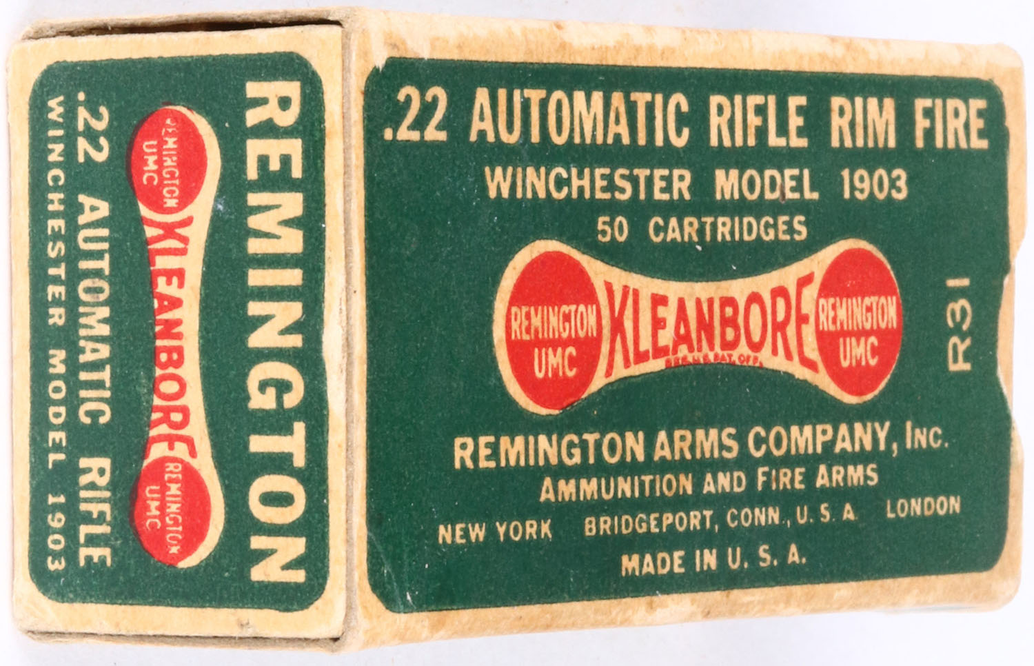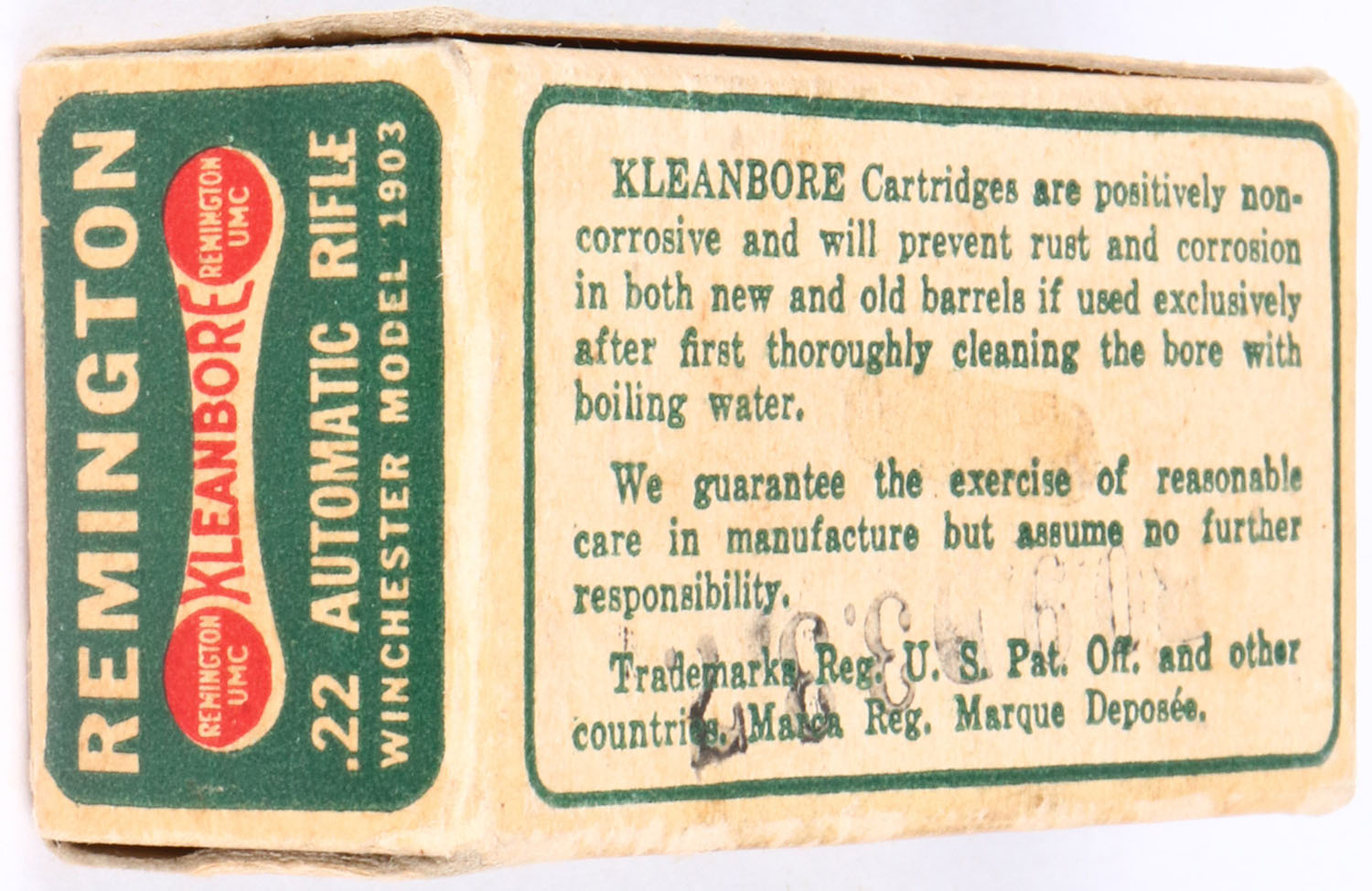 Remington, Kleanbore, .22 Automatic, RHWeb: REM-7.1B WA-1f, Full, 1pc. Green white & red dogbone box, box is solid with excellent color, minor age soiling, very minor corner wear, edges are crisp, end flaps are solid, ammo is excellent. Grade: Excellent + - Value: 20 to 60