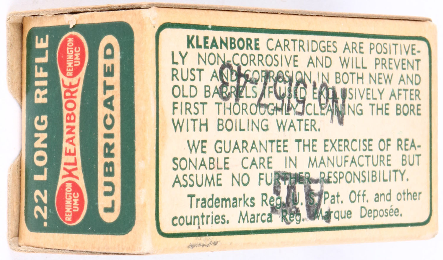 Remington, Kleanbore, .22 Long Rifle, RHWeb: REM-7.2 LR-1j, Full, 1pc. Green white & red dogbone box, box is solid with excellent color, very minor age soiling, corners are sharp, edges are crisp, end flaps are solid, ammo is excellent. Grade: Excellent ++ - Value: 10 to 50