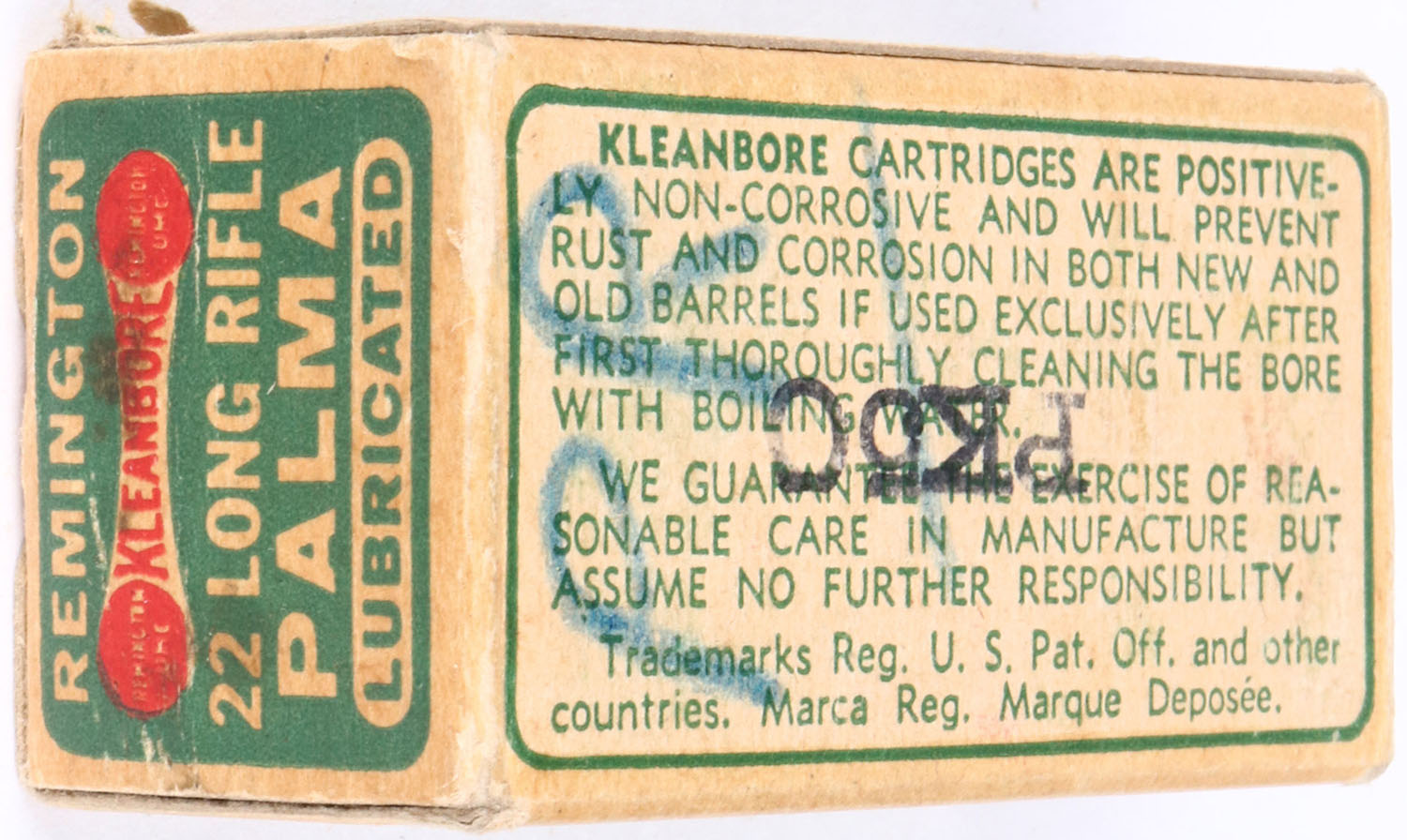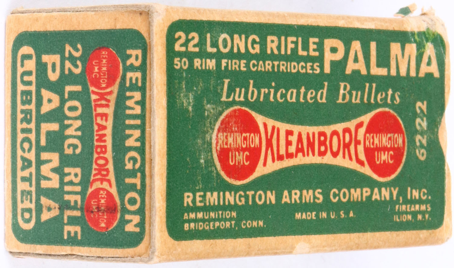 Remington, Palma, .22 Long Rifle, RHWeb: REM-52 LR-13 (diamond thumb cut), Full, 1pc. Green white & red dogbone box, box is solid with very good to excellent color, some age soiling & shelf wear, very minor corner wear, edges are mostly crisp, end flaps are solid, bottom has been written on, ammo is excellent. Grade: Excellent - Value: 6 to 30