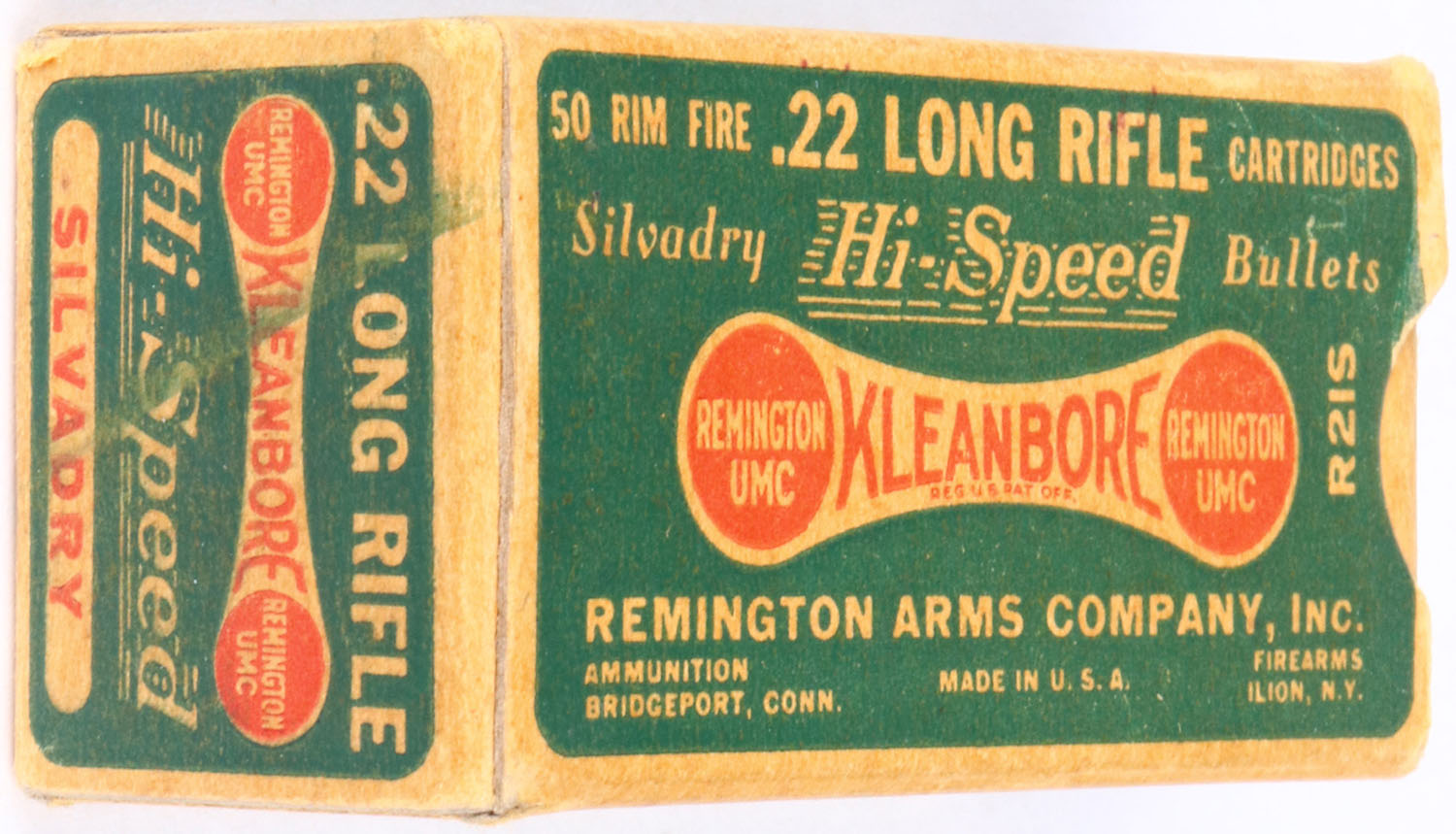 Remington, Hi-Speed Silvadry, .22 Long Rifle, RHWeb: REM-7.5 LR-1f, Full, 1pc. Green buff & red dogbone box, box is solid with excellent color, minor age soiling & corner wear, edges are crisp, end flaps are solid, ammo is excellent to minty. Grade: Excellent ++ - Value: 10 to 50