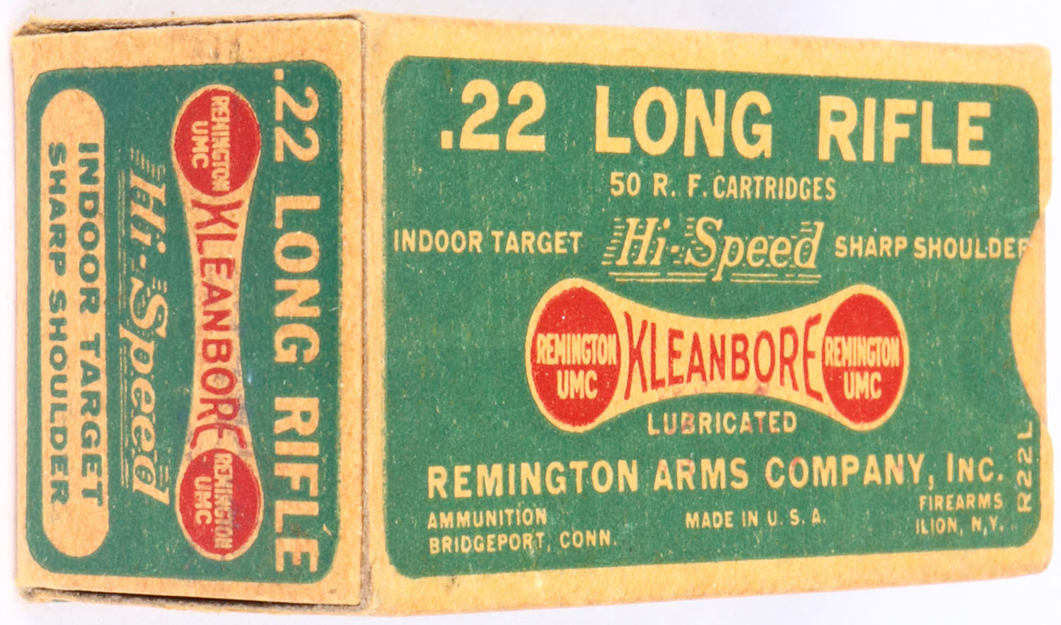 Remington, Hi-Speed Indoor Target, .22 Long Rifle, Sharp Shoulder, RHWeb: REM-69 LR-1a, Full, 1pc. Green buff & red dogbone box, box is solid with excellent color, only very minor age soiling, corners are mostly sharp, edges are crisp, end flaps are solid, ammo is very good to excellent. Grade: Excellent ++ - Value: 20 to 100