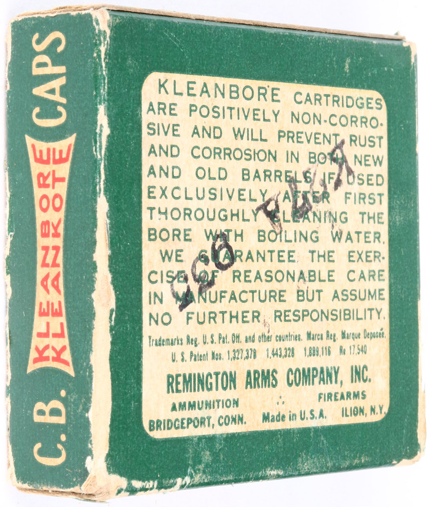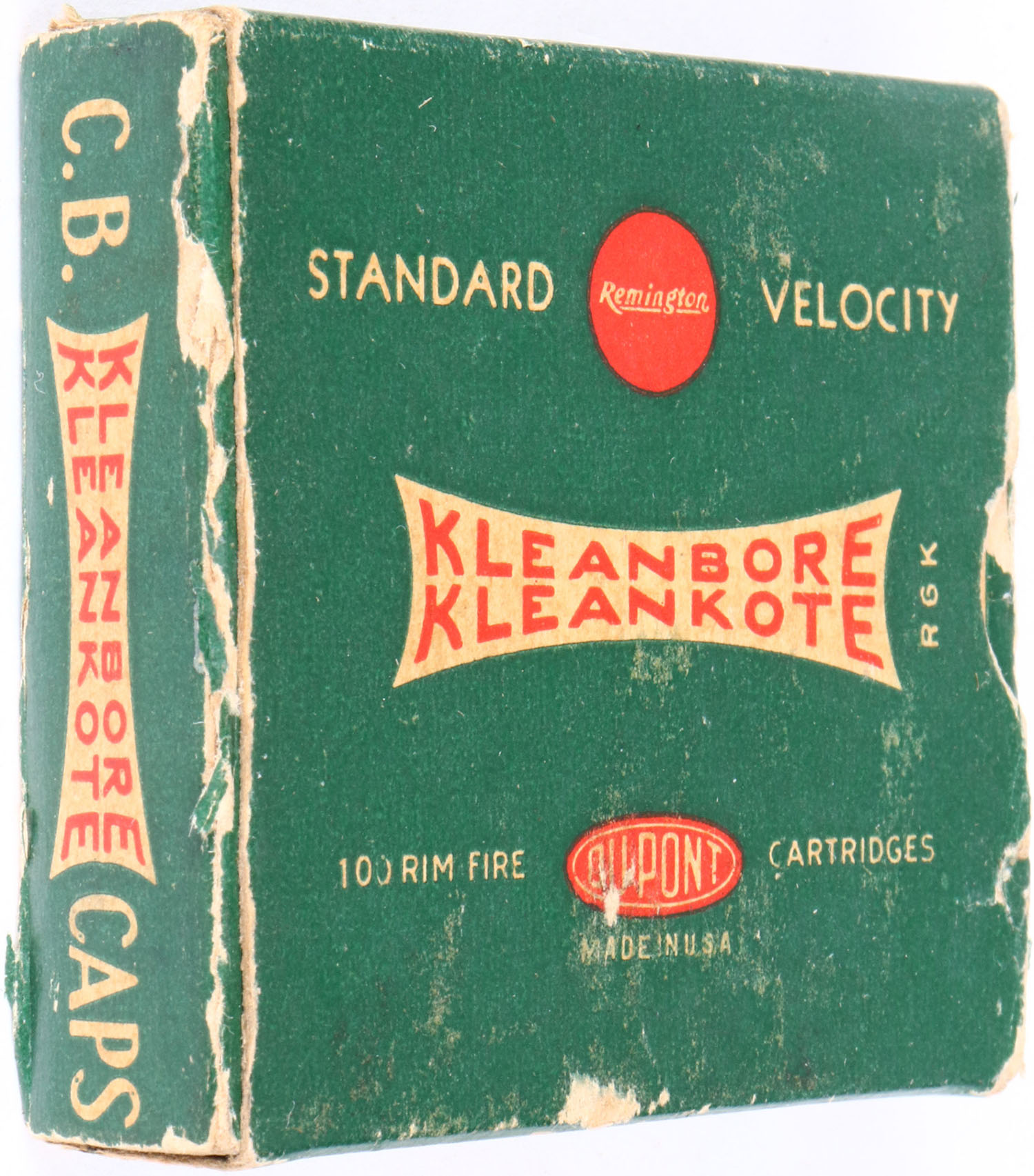 Remington, Kleanbore Kleankote, .22 C.B. Caps, Standard Velocity, RHWeb: REM-9 CB-1e, Full, 1pc. Green white & red box, box is solid with excellent color, minor age soiling, some edge & corner wear, end flaps are solid, ammo is excellent. Grade: Very Good ++ - Value: 30 to 90