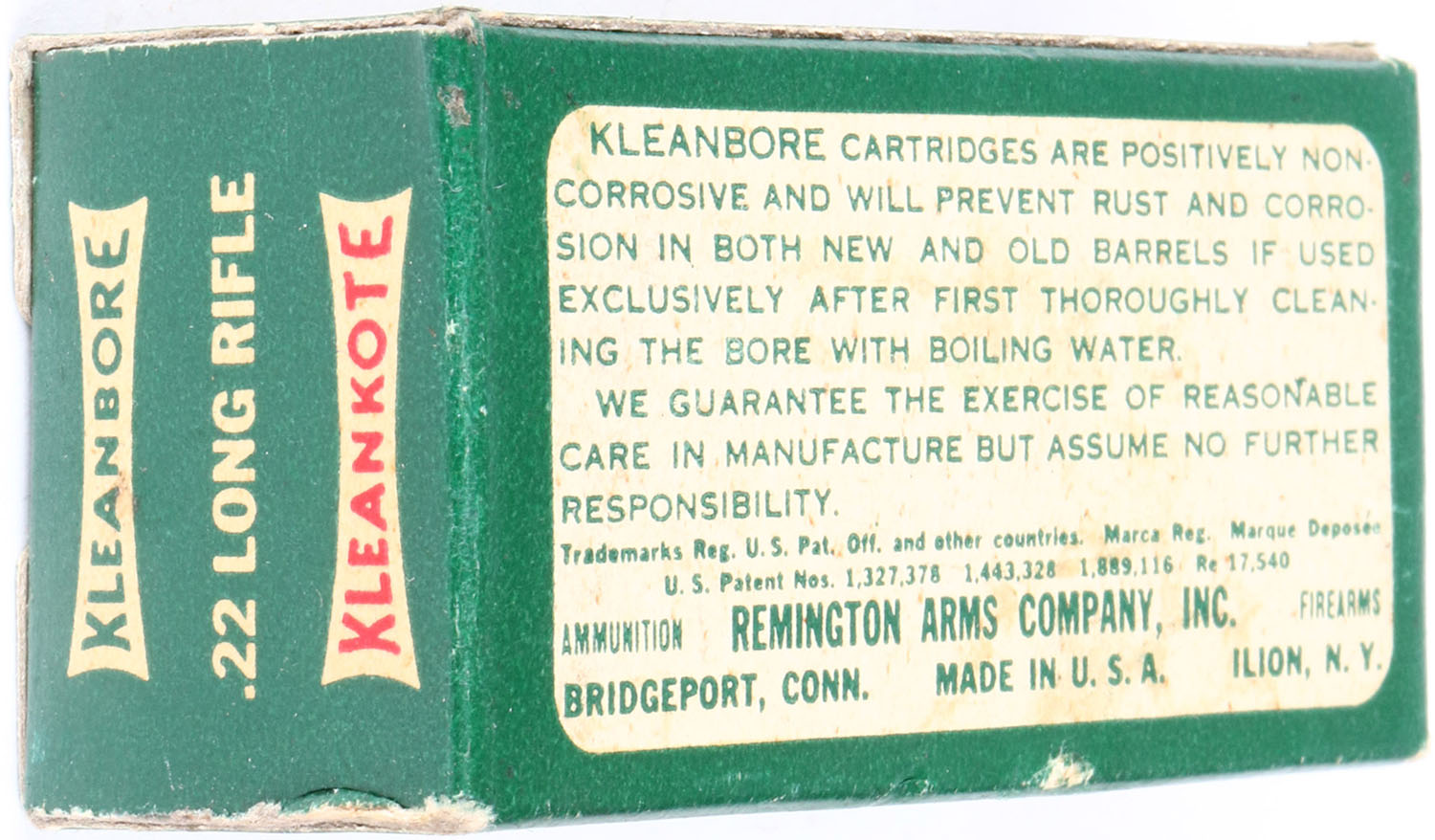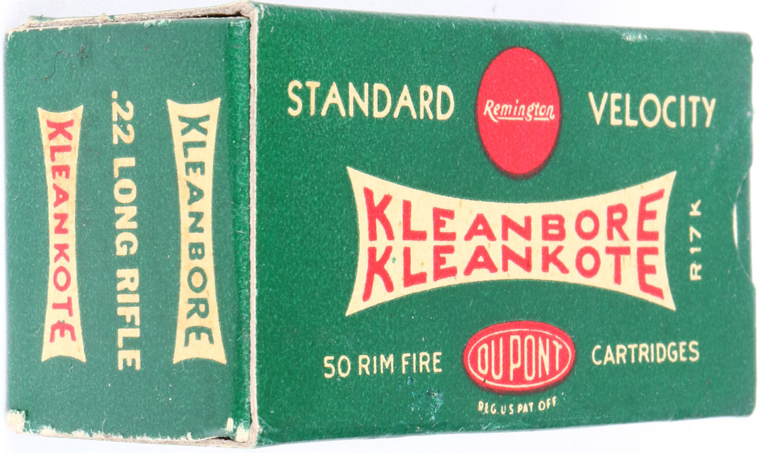 Remington, Kleanbore Kleankote, .22 Long Rifle, Standard Velocity, RHWeb: REM-9 LR-3a, Full, 1pc. Green white & red box, box is solid with excellent to minty color, only very minor corner wear, edges are crisp, end flaps are solid, ammo is very good to excellent. Grade: Excellent ++ - Value: 10 to 50
