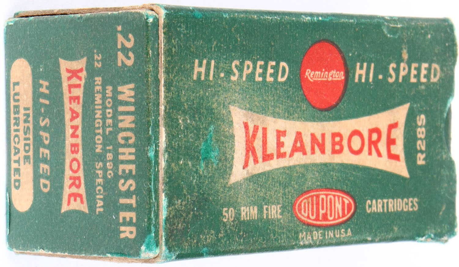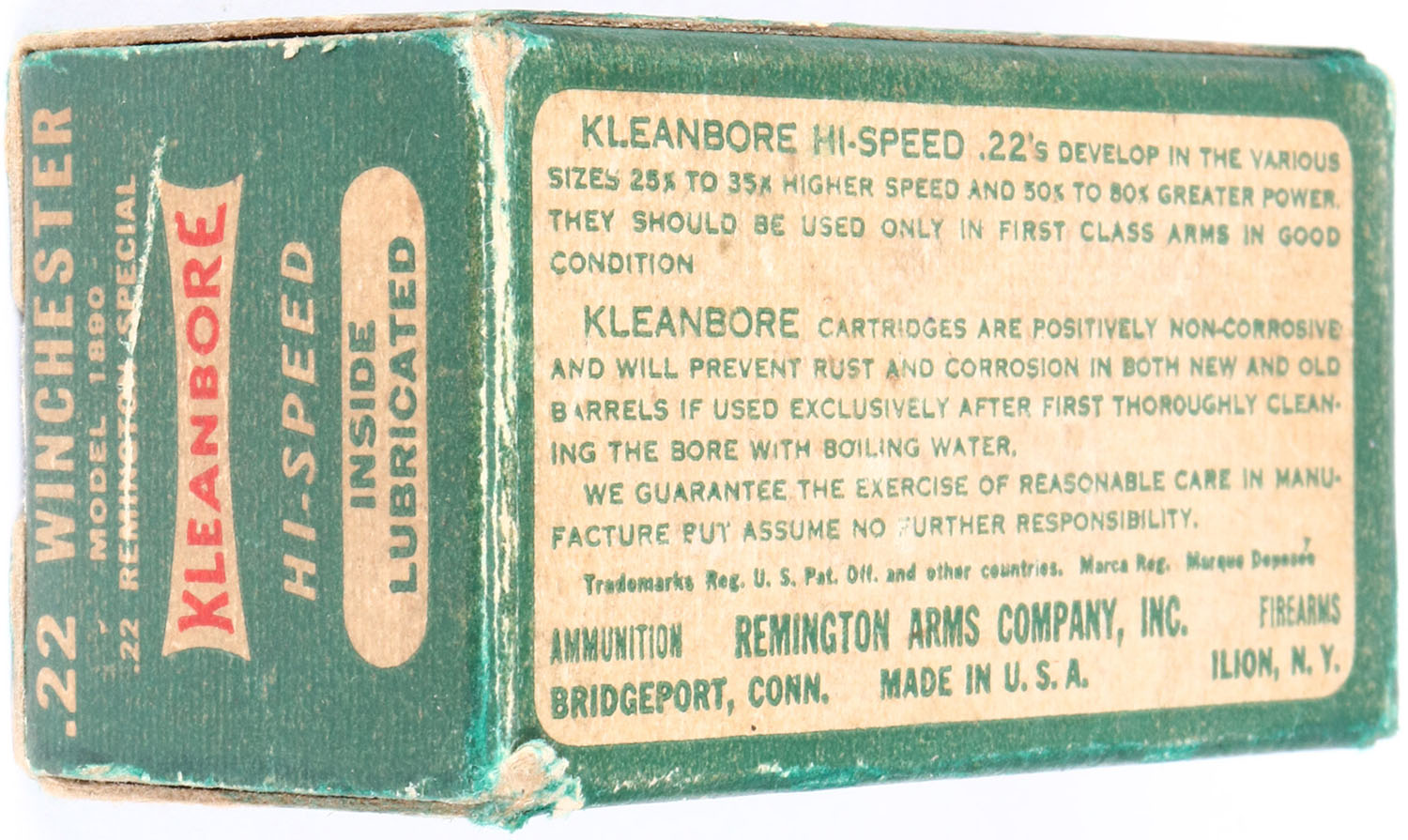 Remington, Kleanbore, .22 Winchester Rim Fire, Hi-Speed, RHWeb: REM-9 WRF-1b, Full, 1pc. Green white & red box, box is solid with very good color, some age soiling & shelf wear, some corner wear, edges are mostly crisp, end flaps are solid, ammo is excellent. Grade: Excellent - Value: 10 to 50