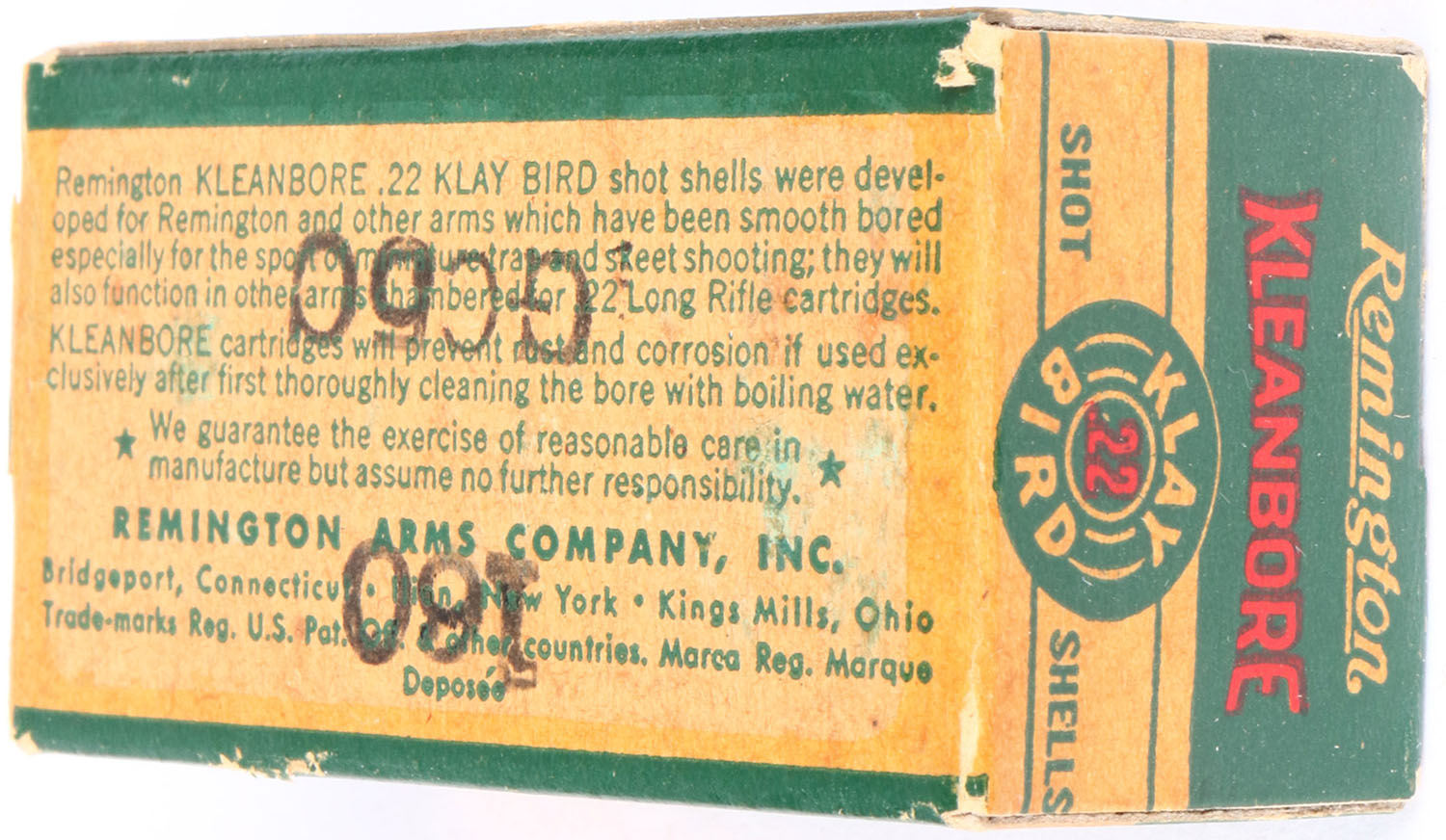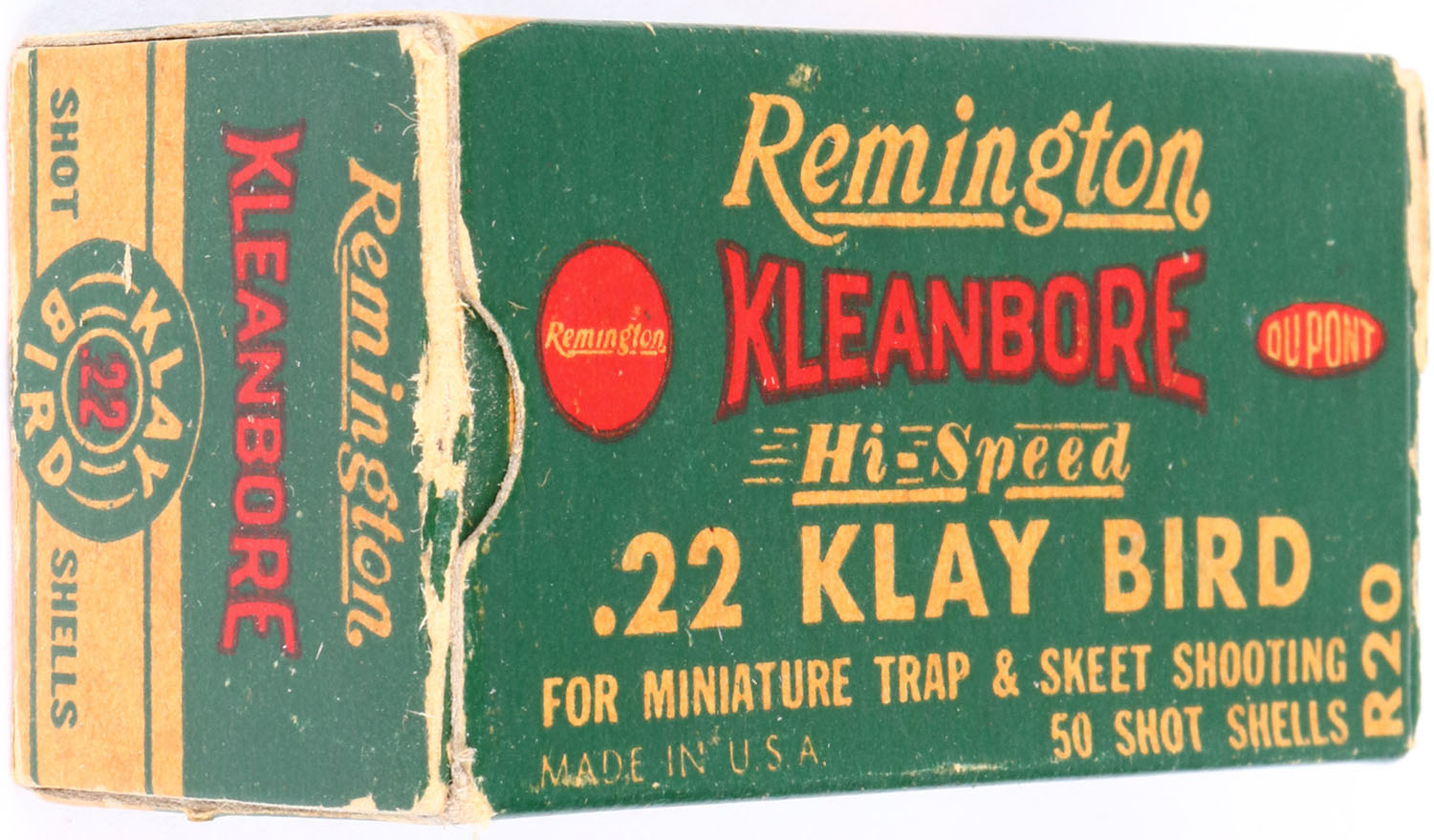 Remington, Kleanbore Hi-Speed, .22 Klay Bird, .22 Long Rifle Shot, RHWeb: REM-10 LR-3a, Full, 1pc. Green white & red box, box is solid with excellent color, some age soiling, minor edge & corner wear, end flaps are solid, ammo is excellent. Grade: Excellent - Value: 20 to 60