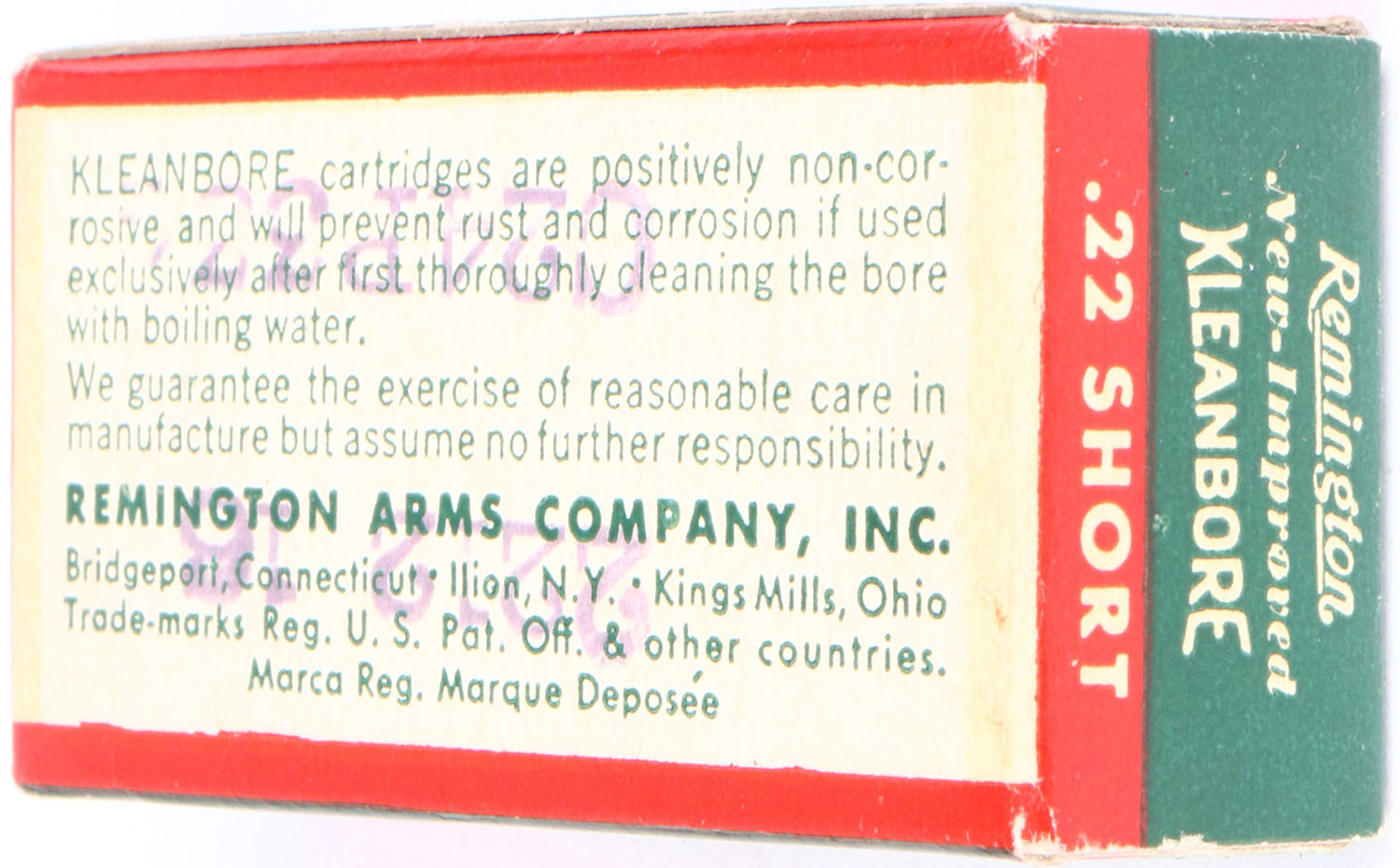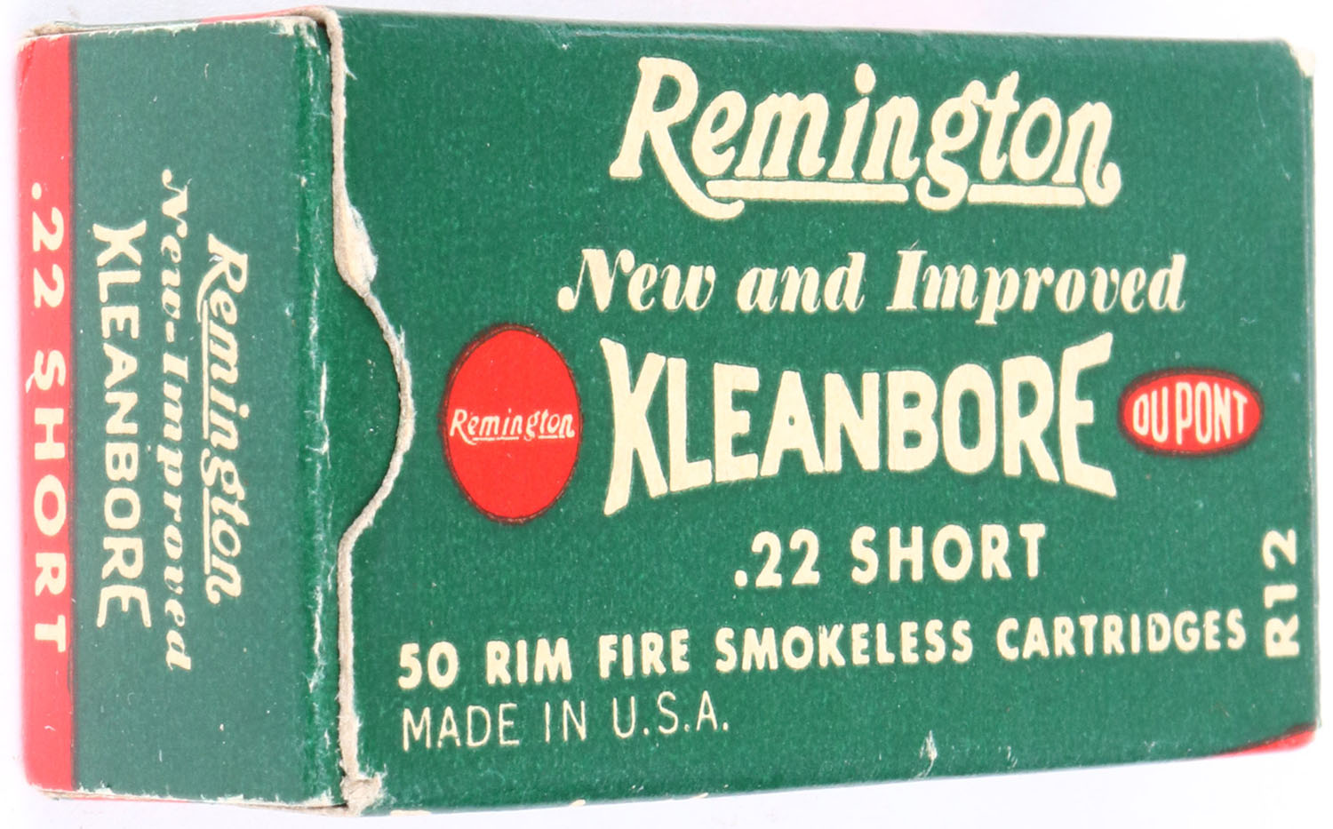 Remington, New and Improved Kleanbore, .22 Short, RHWeb: REM-11 S-1, Full, 1pc. Green white & red box, box is solid with excellent color, minor corner wear, edges are mostly crisp, end flaps are solid, ammo is excellent. Grade: Excellent + - Value: 10 to 50