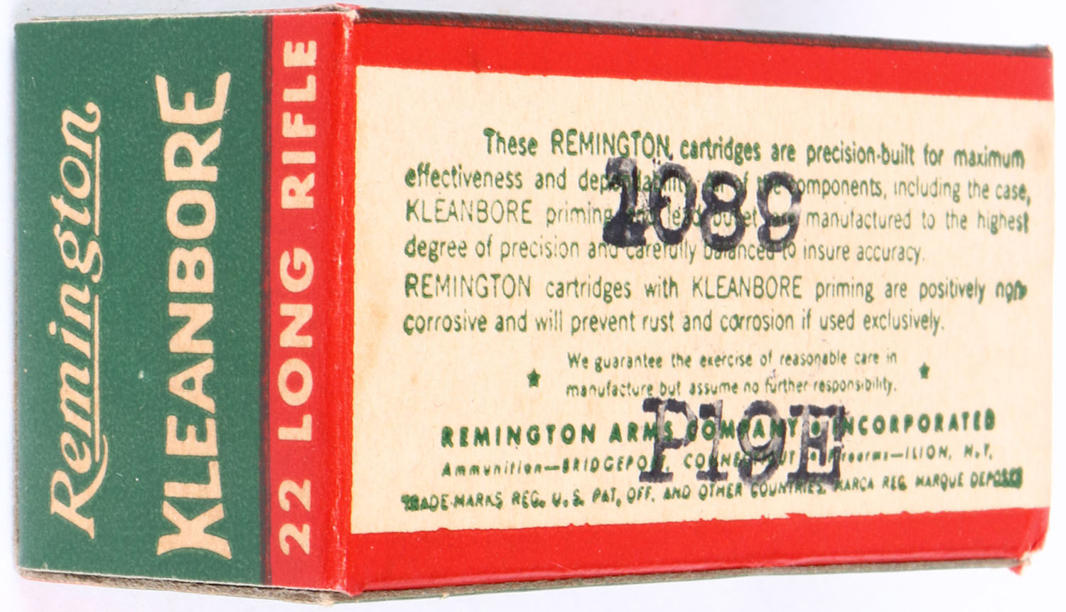 Remington, Kleanbore, .22 Long Rifle, Intermediate Velocity, RHWeb: REM-13 LR-2, Full, 1pc. Green white & red box, box is solid with excellent to minty color, small stain on top, corners are mostly sharp, edges are crisp, end flaps are solid, ammo is excellent. Grade: Excellent ++ - Value: 10 to 50