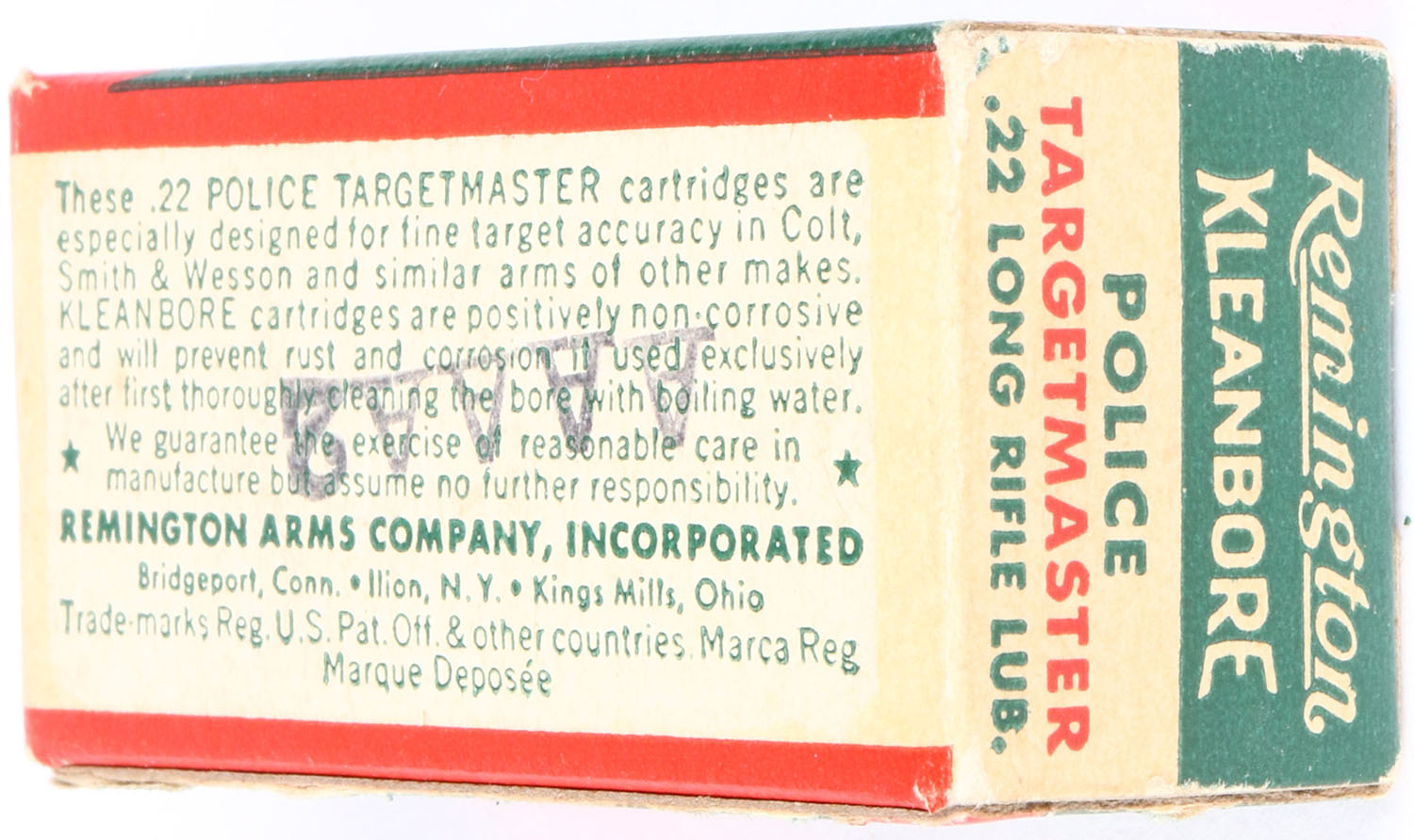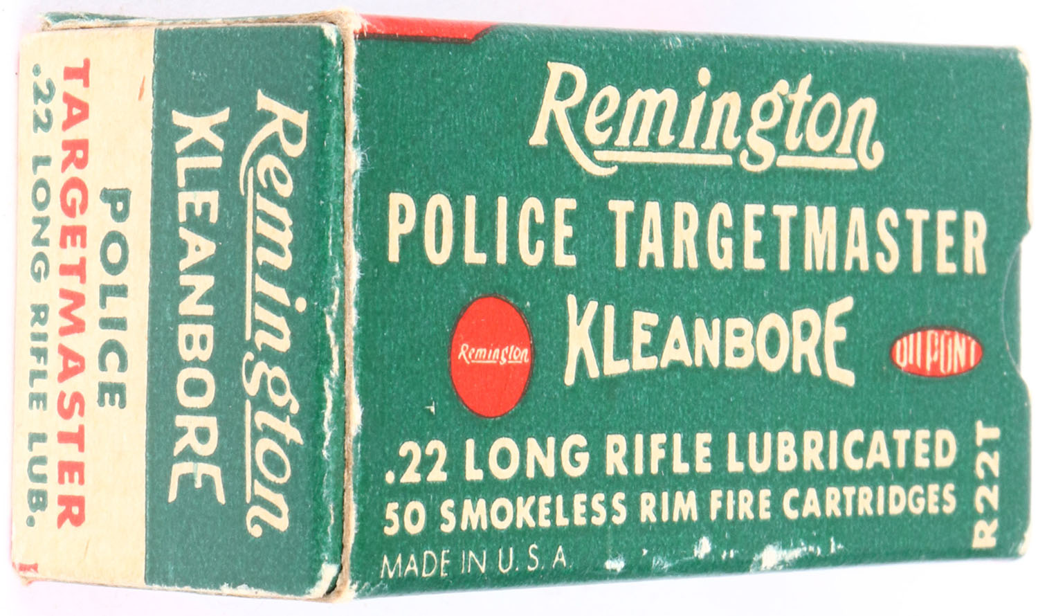 Remington, Police Targetmaster, .22 Long Rifle, RHWeb: REM-69 LR-2b, Full, 1pc. Green white & red box, box is solid with excellent color, very minor age soiling & edge wear, minor corner wear, end flaps are solid, ammo is excellent. Grade: Excellent + - Value: 20 to 60