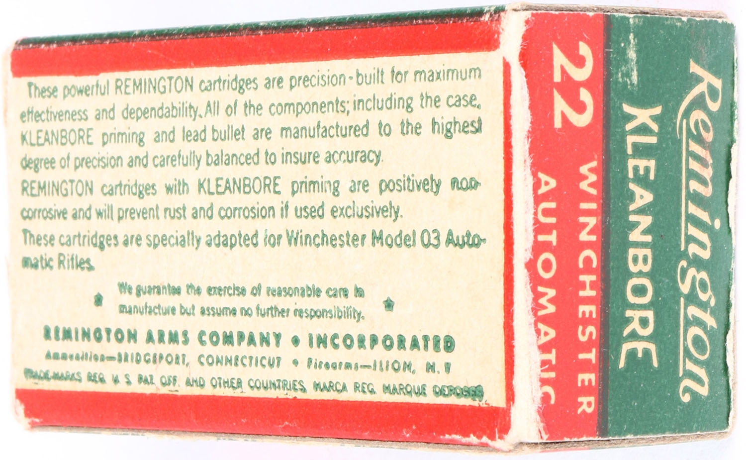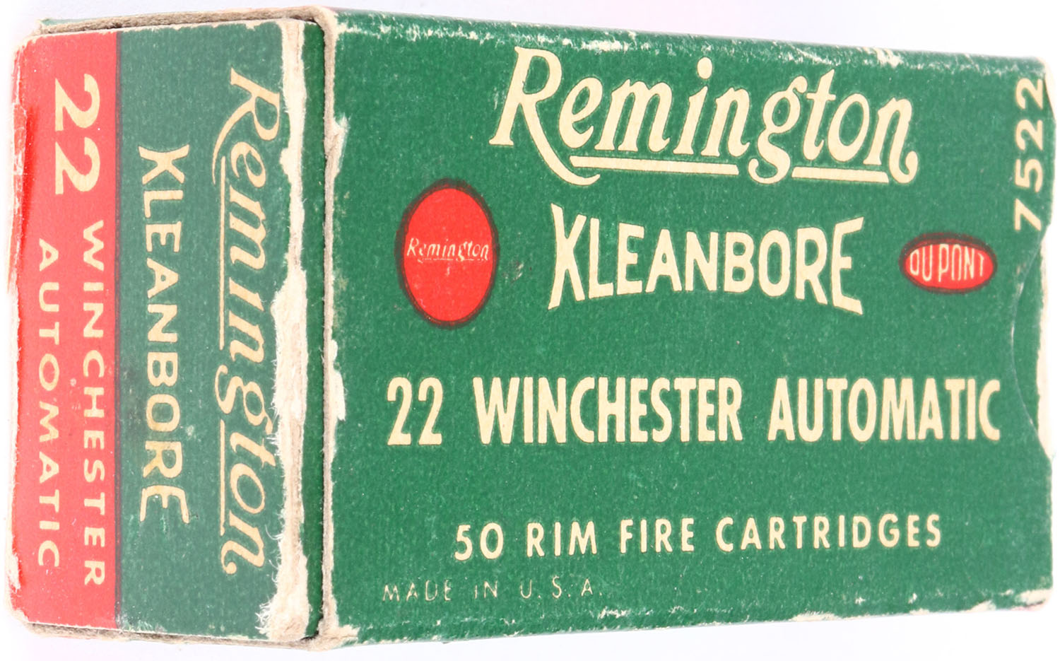 Remington, Kleanbore, .22 Winchester Automatic, RHWeb: REM-12 WA-1b, Full, 1pc. Green white & red box, box is solid with excellent color, very minor age soiling, some edge & corner wear, end flaps are solid, ammo is excellent. Grade: Excellent + - Value: 20 to 60