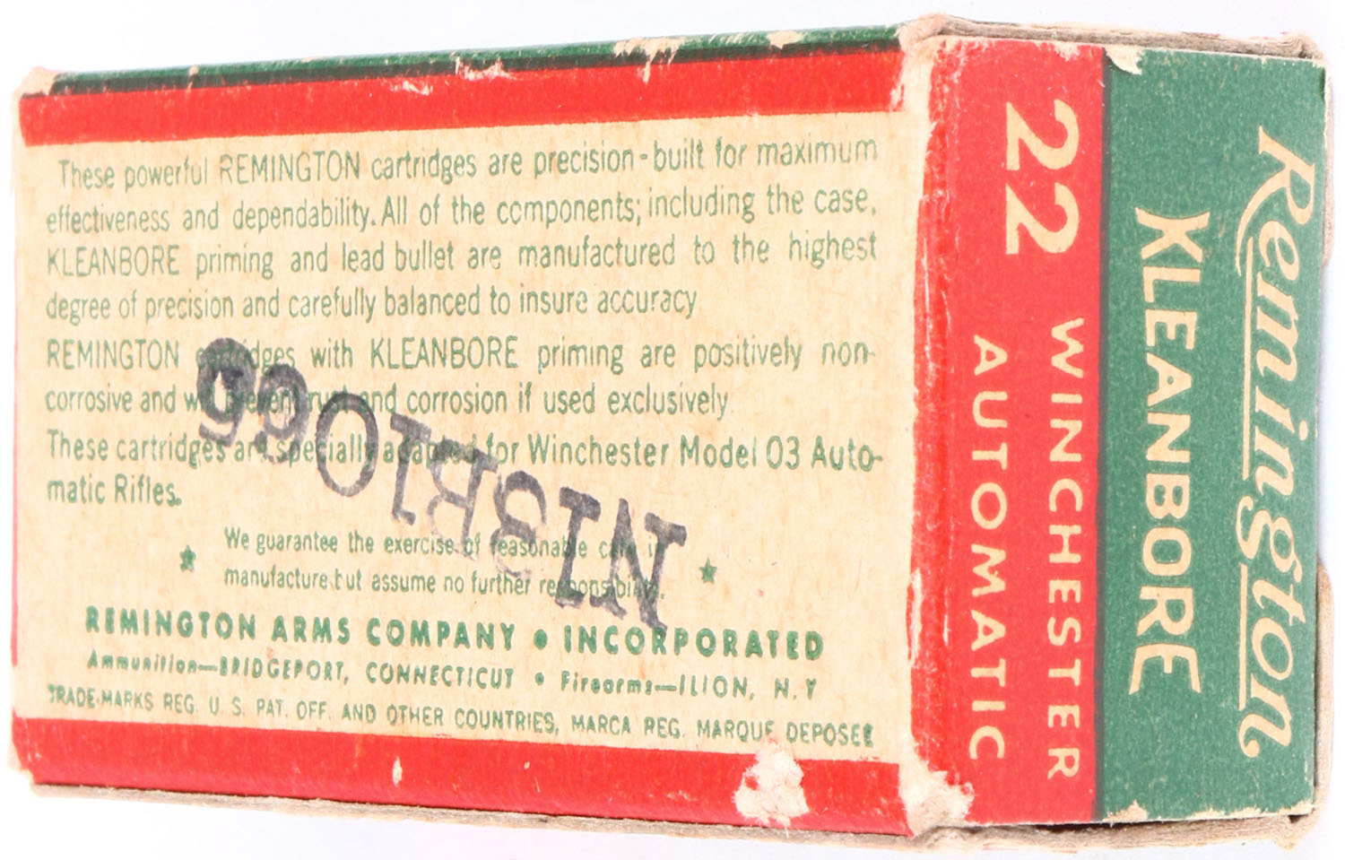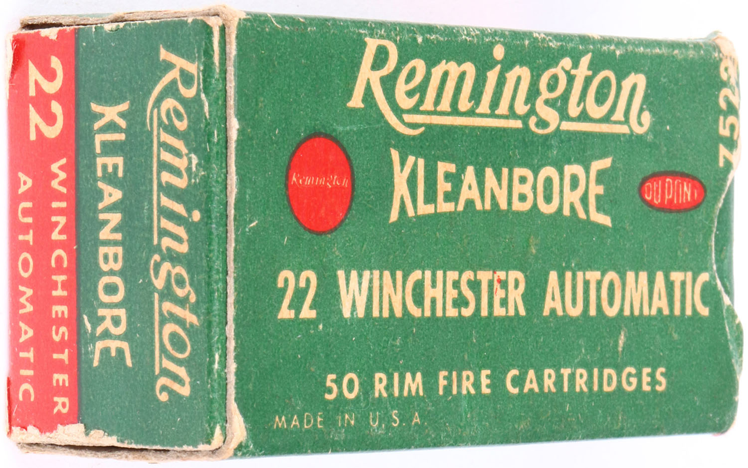 Remington, Kleanbore, .22 Winchester Automatic, RHWeb: REM-12 WA-1a, Full, 1pc. Green white & red box, box is solid with excellent color, some age soiling, minor corner wear, edges are mostly crisp, end flaps are solid, ammo is excellent. Grade: Excellent - Value: 10 to 50