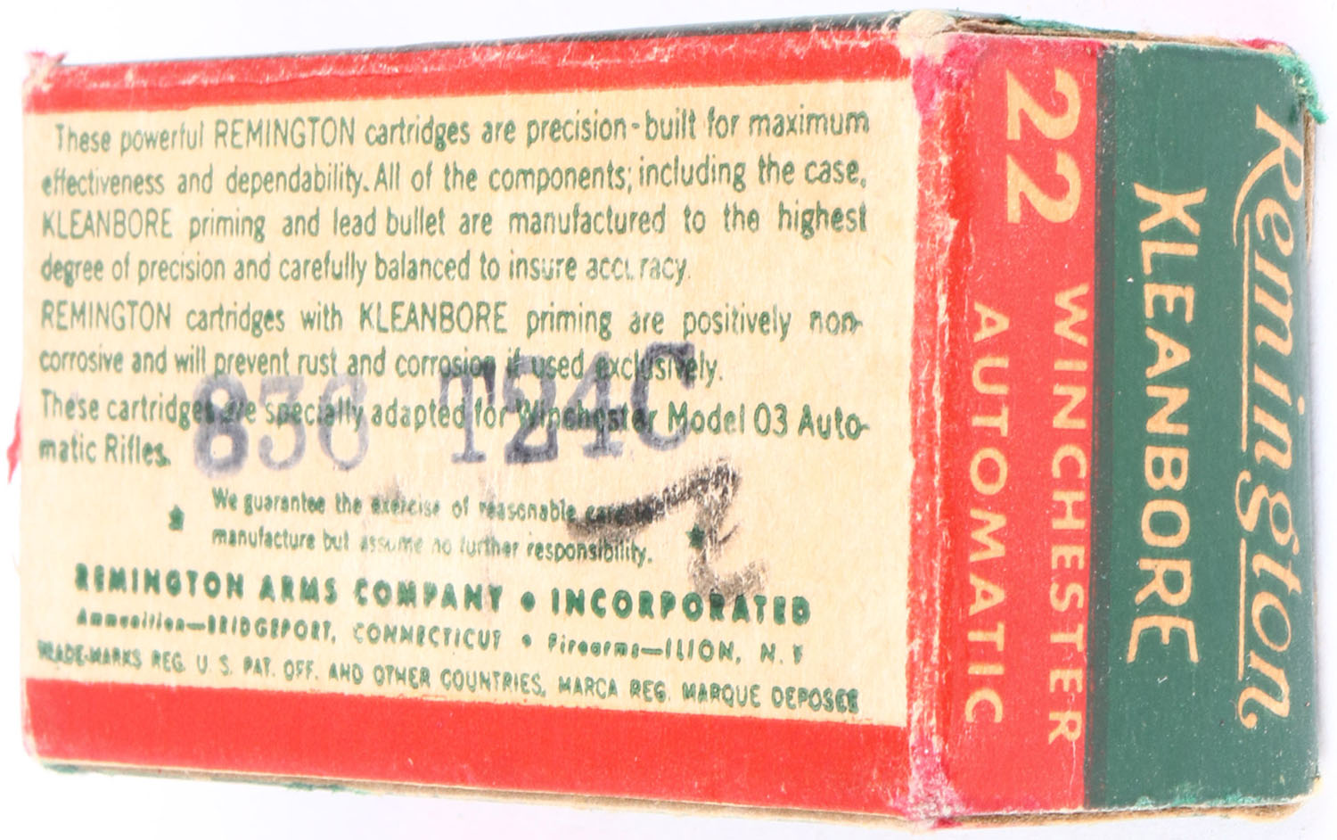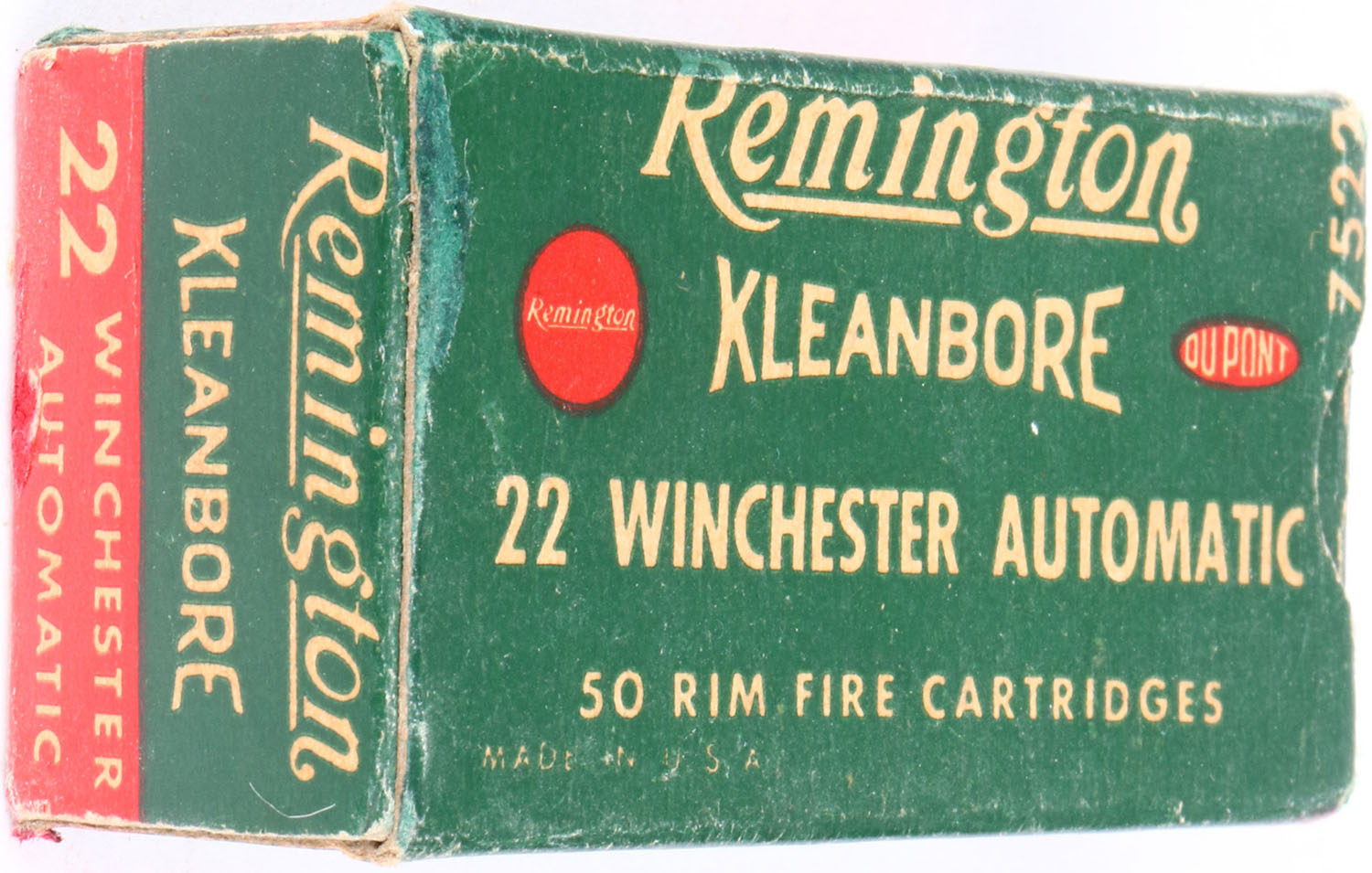 Remington, Kleanbore, .22 Winchester Automatic, RHWeb: REM-12 WA-1a, Full, 1pc. Green white & red box, box is solid with excellent color, some age soiling, minor corner wear, edges are mostly crisp, end flaps are solid, ammo is excellent. Grade: Excellent - Value: 10 to 50