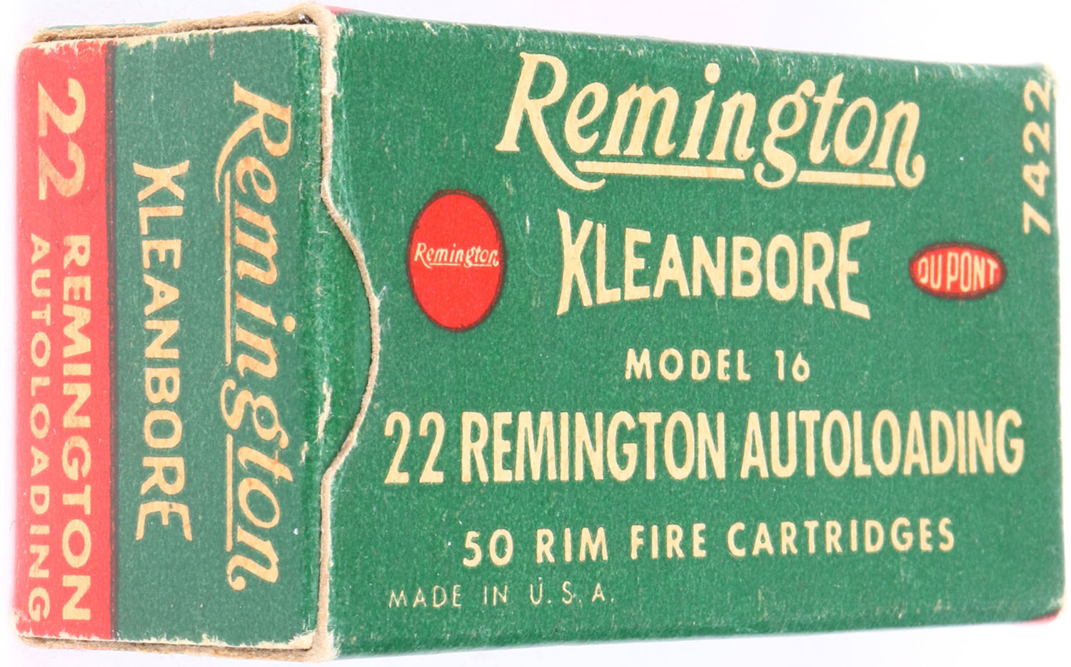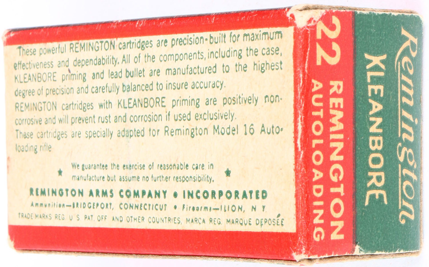 Remington, Kleanbore, .22 Remington Autoloading, RHWeb: REM-12 RA-1, Full, 1pc. Green white & red box, box is solid with excellent color, minor age soiling & corner wear, edges are mostly crisp, end flaps are solid, ammo is excellent. Grade: Excellent + - Value: 100 to 200