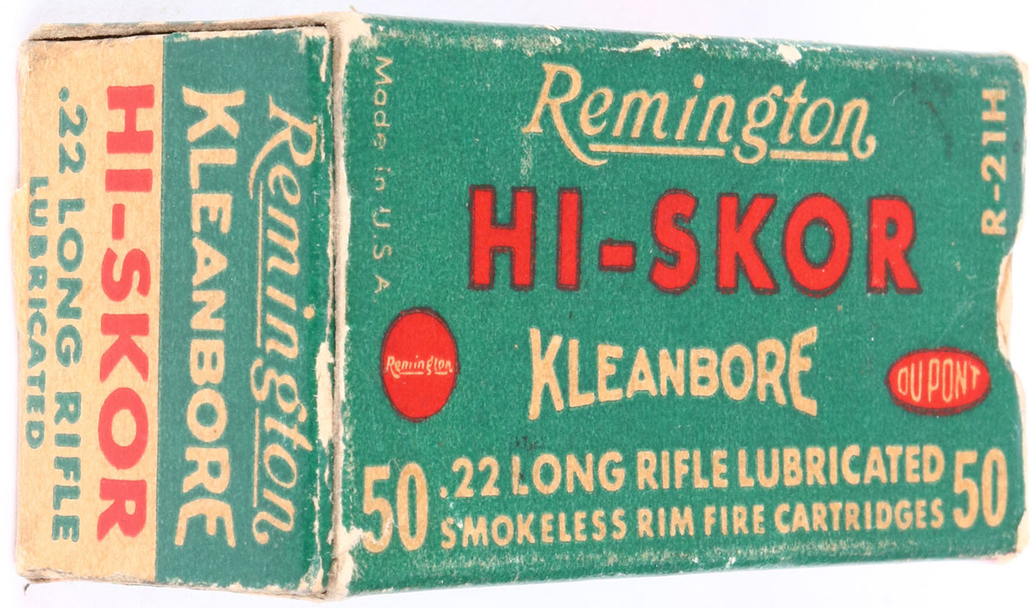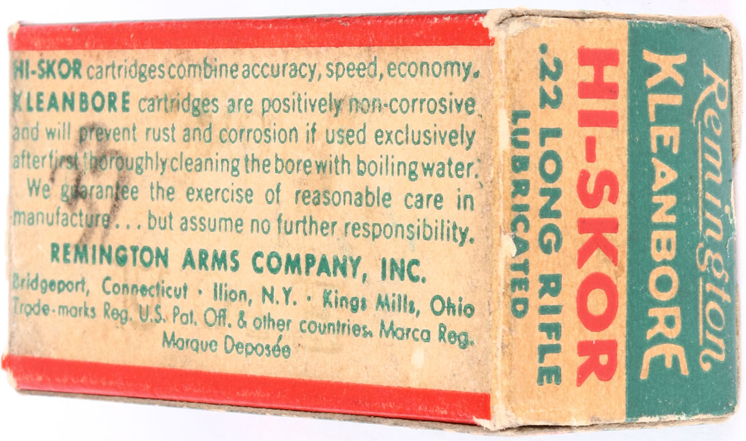 Remington, Hi-Skor, .22 Long Rifle, Lubricated, RHWeb: REM-53 LR-1b, Full, 1pc. Green red & white box, box is solid with very good to excellent color, some age soiling & corner wear, edges are mostly crisp, end flaps are solid, ammo is excellent. Grade: Excellent - Value: 10 to 50