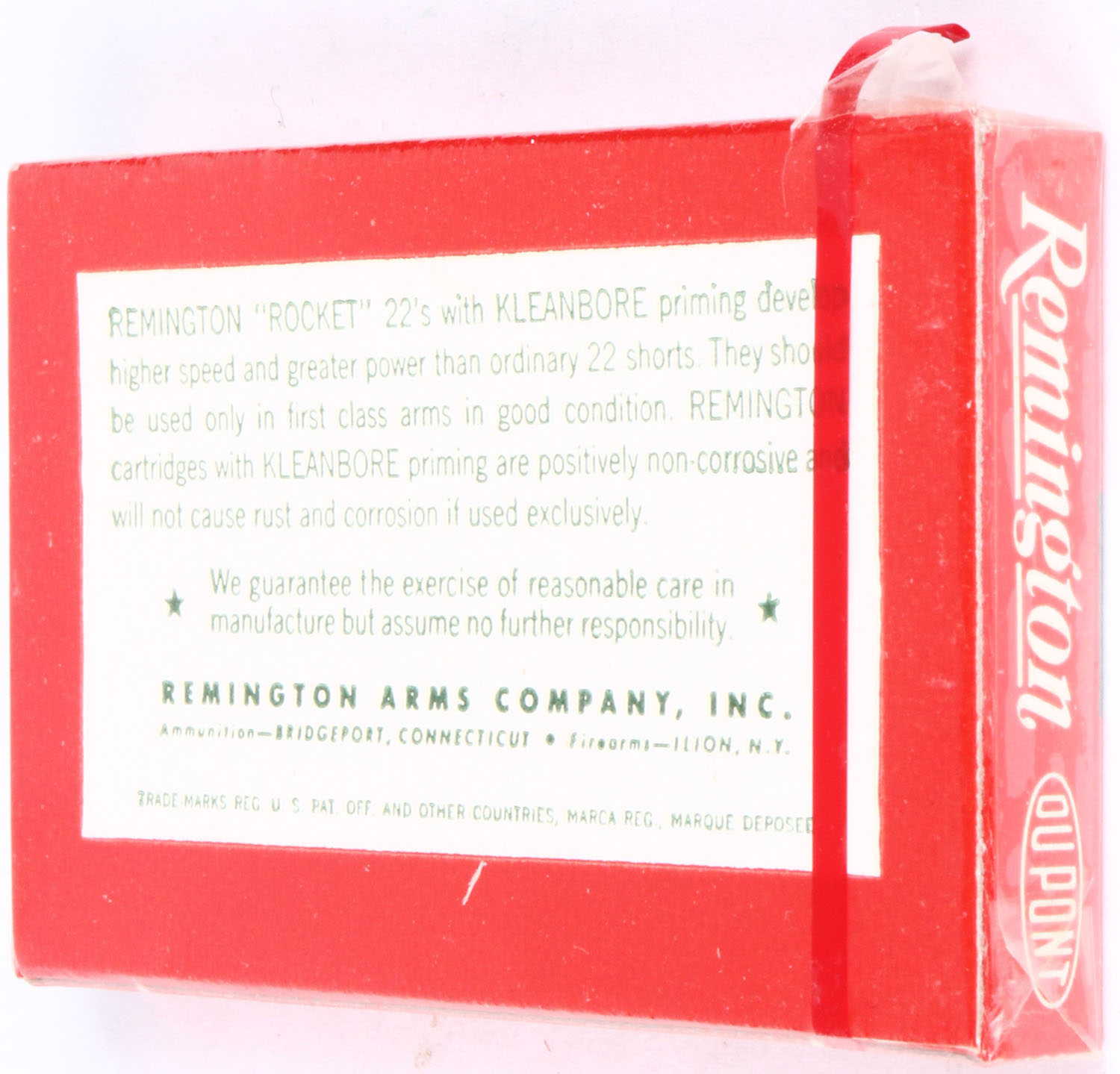 Remington, ''Rocket'', .22 Short, RHWeb: REM-14 S-5, FULL & SEALED, 1pc. Red white & green box, box is MINT with minty color, corners are sharp, edges are crisp, ammo is mint. Grade: MINT - Value: 20 to 60