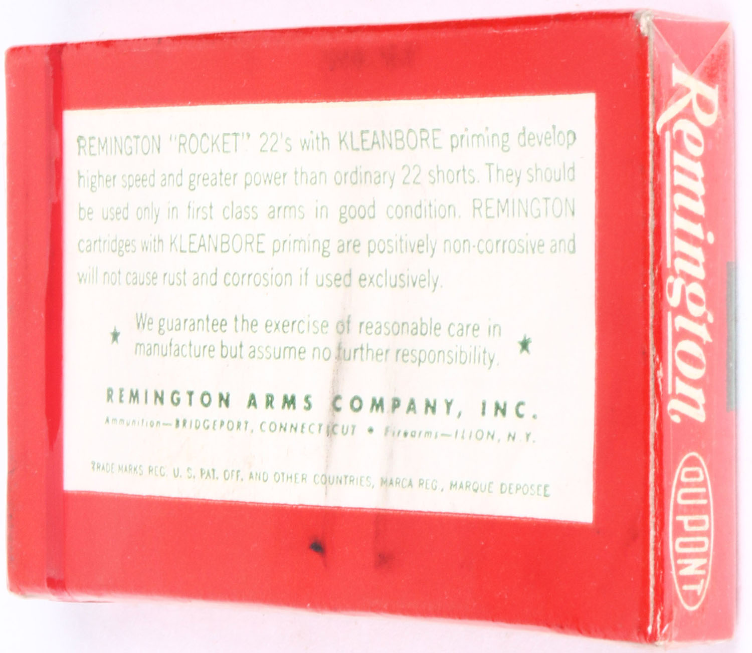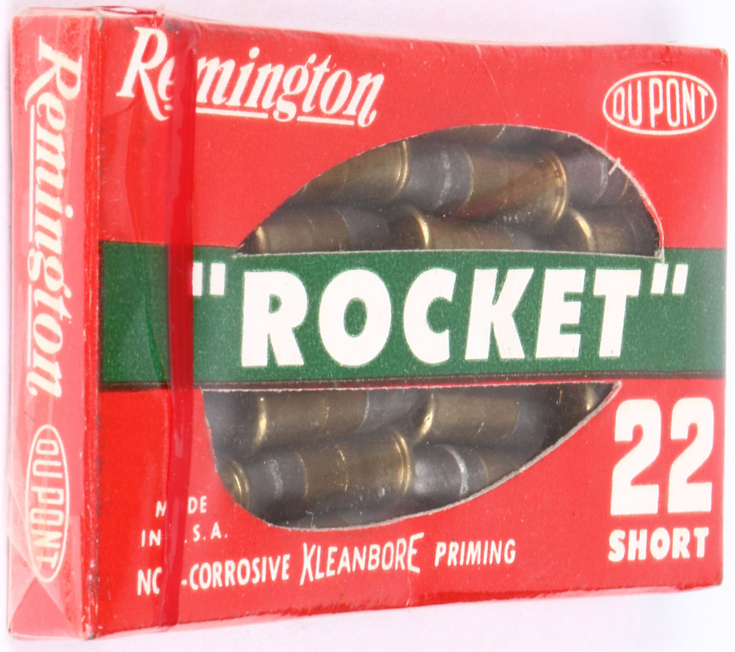 Remington, ''Rocket'', .22 Short, RHWeb: REM-14 S-5, FULL & SEALED, 1pc. Red white & green box, box is near mint with minty color, only has minor deformity - appears to have had something heavy set on it, small tear in clear packaging, corners are sharp, edges are mostly crisp, ammo is mint. Grade: Excellent + - Value: 10 to 50