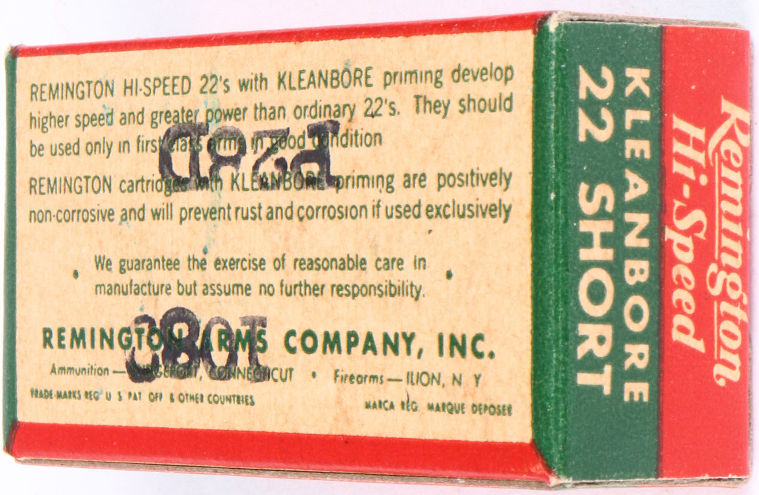 Remington, Hi-Speed Kleanbore, .22 Short, RHWeb: REM-14 S-1c, Full, 1pc. Red green & white box, box is solid with excellent color, very minor age soiling, corners are sharp, edges are crisp, end flaps are solid, ammo is minty. Grade: Excellent ++ - Value: 10 to 50
