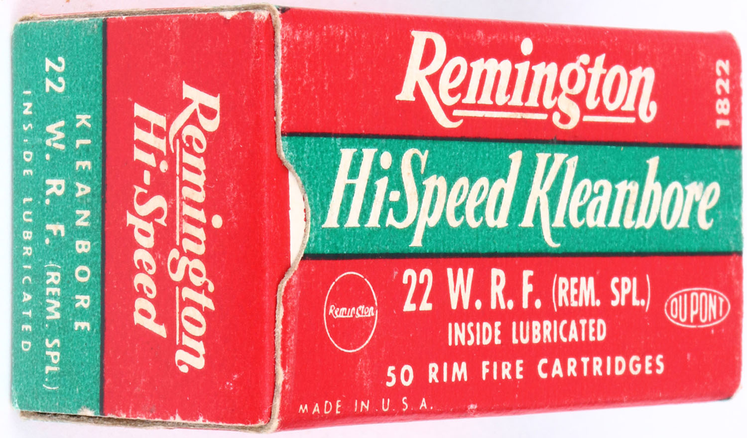 Remington, Hi-Speed Kleanbore, .22 W.R.F. (Rem. Spl.), RHWeb: REM-14 WRF-1c, Full, 1pc. Red green & white box, box is solid with minty color, very minor corner wear, edges are crisp, end flaps are solid, ammo is excellent. Grade: Excellent ++ - Value: 10 to 50