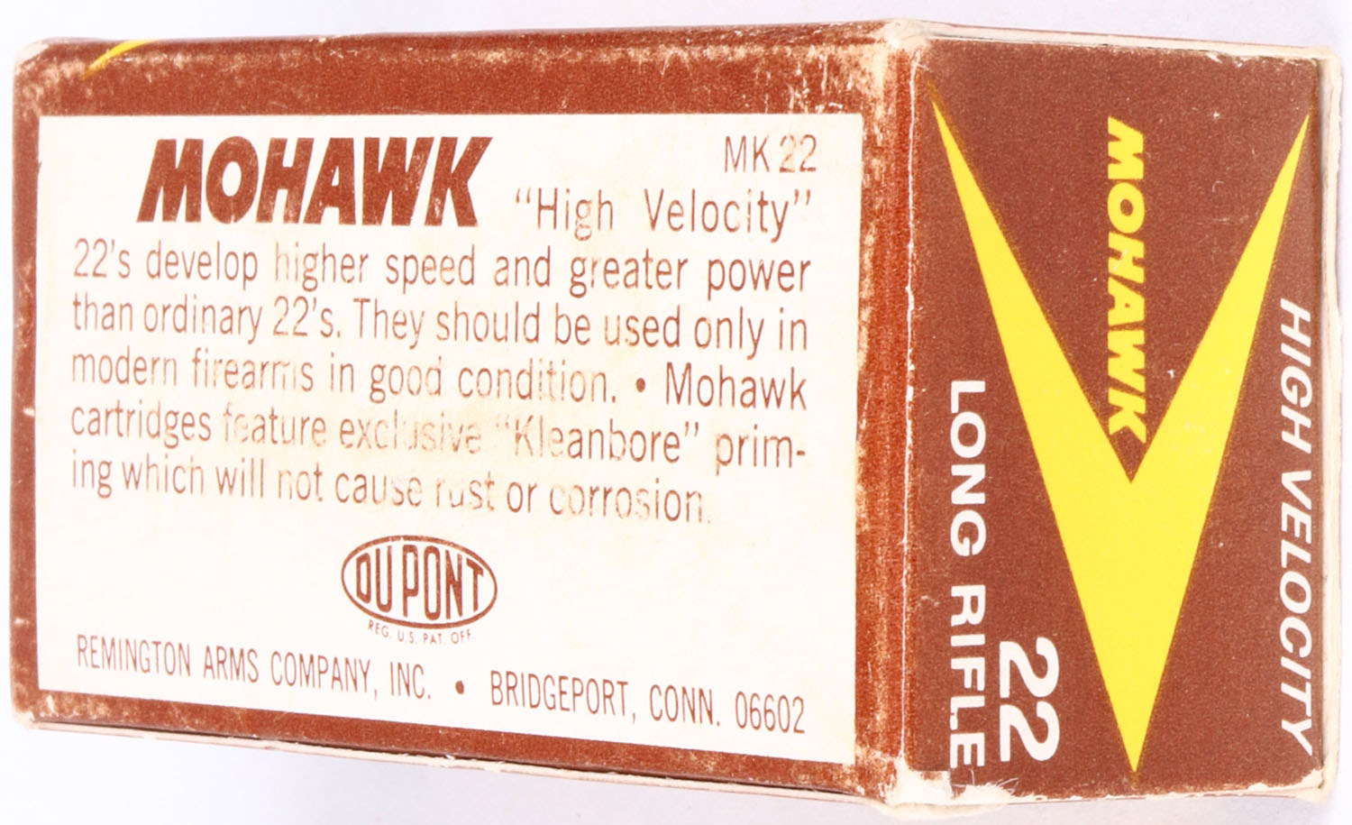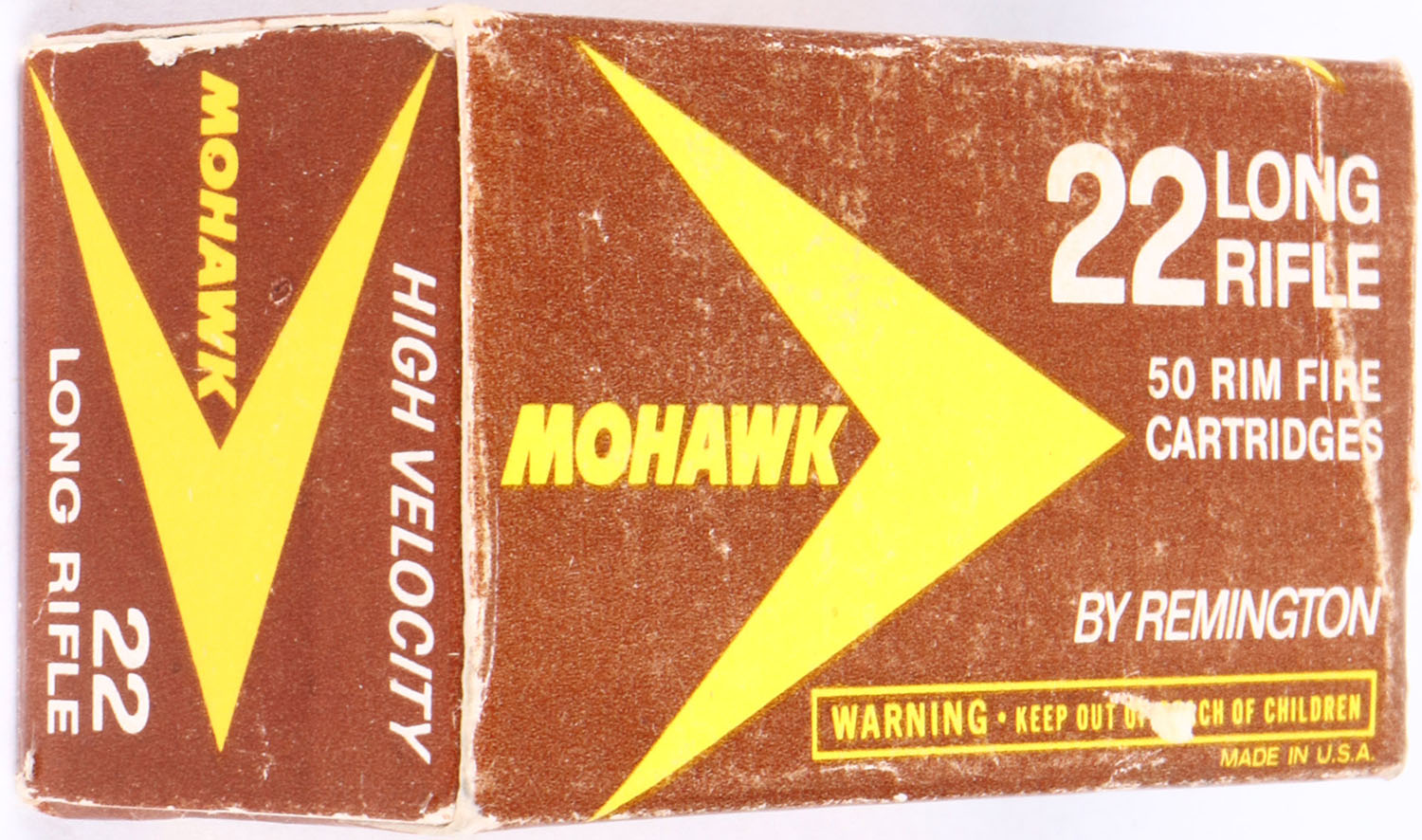 Remington, Mohawk, .22 Long Rifle, High Velocity, RHWeb: REM-30 LR-2, Full, 1pc. Brown yellow & white box, box is solid with very good color, some color fading, minor edge & corner wear, end flaps are solid, ammo is excellent. Grade: Excellent - Value: 4 to 40