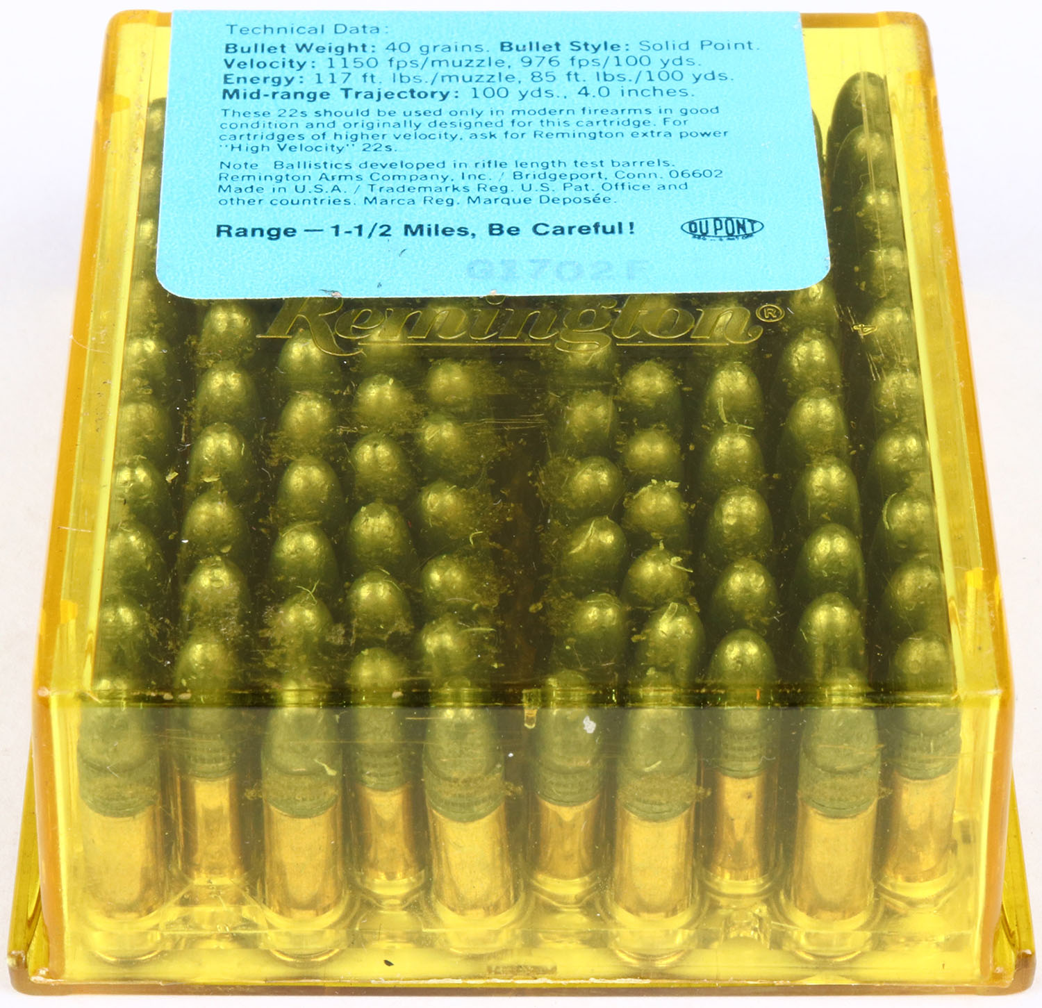 Remington, 22 Target, .22 Long Rifle, Standard Velocity, RHWeb: REM-55A LR-2, FULL & SEALED, 2pc. Yellow plastic tray with green & blue sealing label, box is solid, label has excellent color but is slightly faded, label is intact, ammo appears minty. Grade: Excellent ++ - Value: 10 to 50